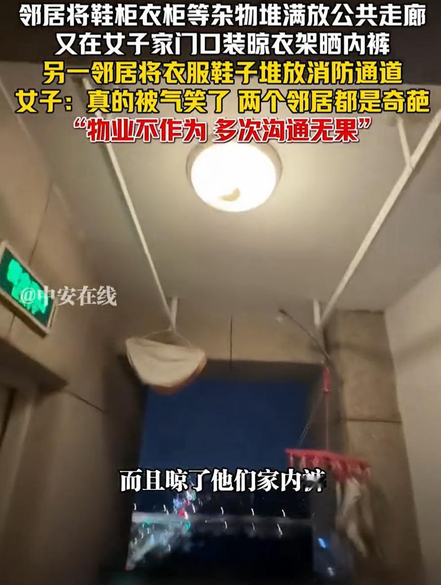 “被气笑了!”浙江杭州,一女子在网上吐槽,自己有两个奇葩邻居,三人共用一个公共走廊,结果却成了另外两家的后花园,摆满了衣架鞋架不说,甚至把内裤都挂到女子家门口,这让她实在忍无可忍 从女子拍摄的视频来看,她家所在的单元,三户人家共用一条公共走廊。原本该是干净畅通的通道,眼下却变了样,几乎成了另外两家邻居的储物间和阳台 鞋柜、杂物箱见缝插针地堆着,人侧着身才能勉强通过。更让她难以接受的是,不知哪家邻居还在走廊里拉起了晾衣绳,内衣、内裤堂而皇之地晾在离她家门不到一米的地方 每天一推开门,映入眼帘的不是干净的公共空间,而是邻居的私人物品,特别是那些贴身衣物,几乎悬在头顶。衣服滴落的水渍沾湿门口地面,偶尔还有说不清的异味飘进屋里 她也曾试着去沟通,但邻居理直气壮,认为公共走廊大家都能用,自己想摆什么就摆什么。找到物业,物业上门劝说几次,效果寥寥,事情拖了大半个月,走廊里的东西一样没少,内衣裤依旧每天准时“亮相” 很多人看到这类事都会说一句算了,邻里之间别闹太僵。可真正住在里面的人才知道,这不是小摩擦,这是每天都要面对的不舒服。公共区域被侵占,影响通行不说,还涉及卫生和隐私。你不可能要求一个人每天笑着面对别人家的内裤 这类问题最让人憋屈的地方在于模糊。公共区域人人能用,但不等于谁先占了就是谁的,更不等于可以影响别人正常生活。现实里,往往是占用的人最强硬,被影响的人最疲惫。物业怕麻烦,邻居不讲理,最后所有成本都压在那个不愿意忍的人身上 换个角度看,这事其实不复杂。公共走廊不是储藏室,也不是晾衣间,更不是谁的私人领地。能不能用,边界在哪里,本该有清晰规则。规则不清,执行不到位,就会变成比谁脸皮厚。久而久之,讲理的人反而成了少数