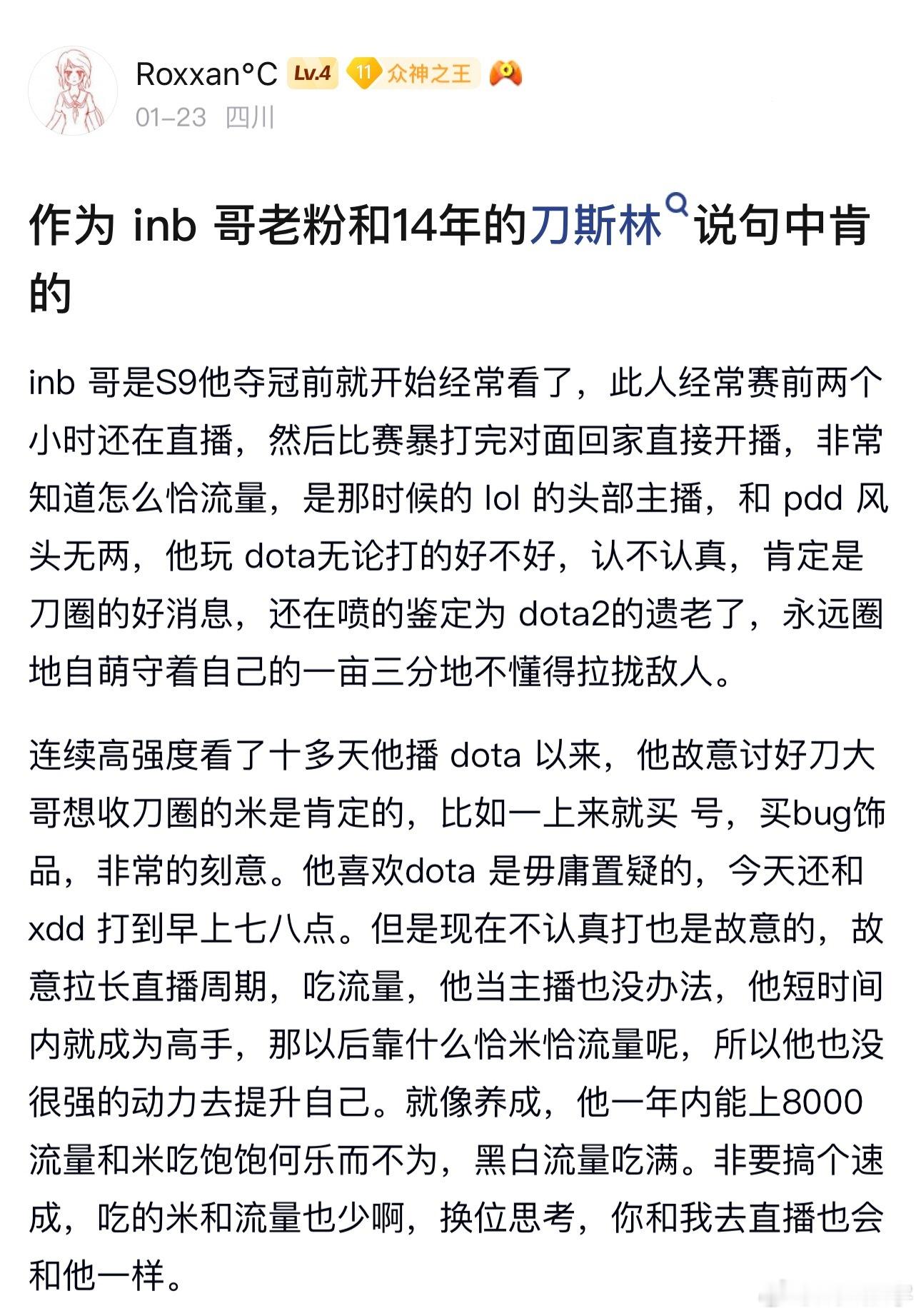 一个作为doinb老粉的刀斯林发帖客观评价了doinb最近转刀这波流量,确实对dota2来说是件好事dota2
