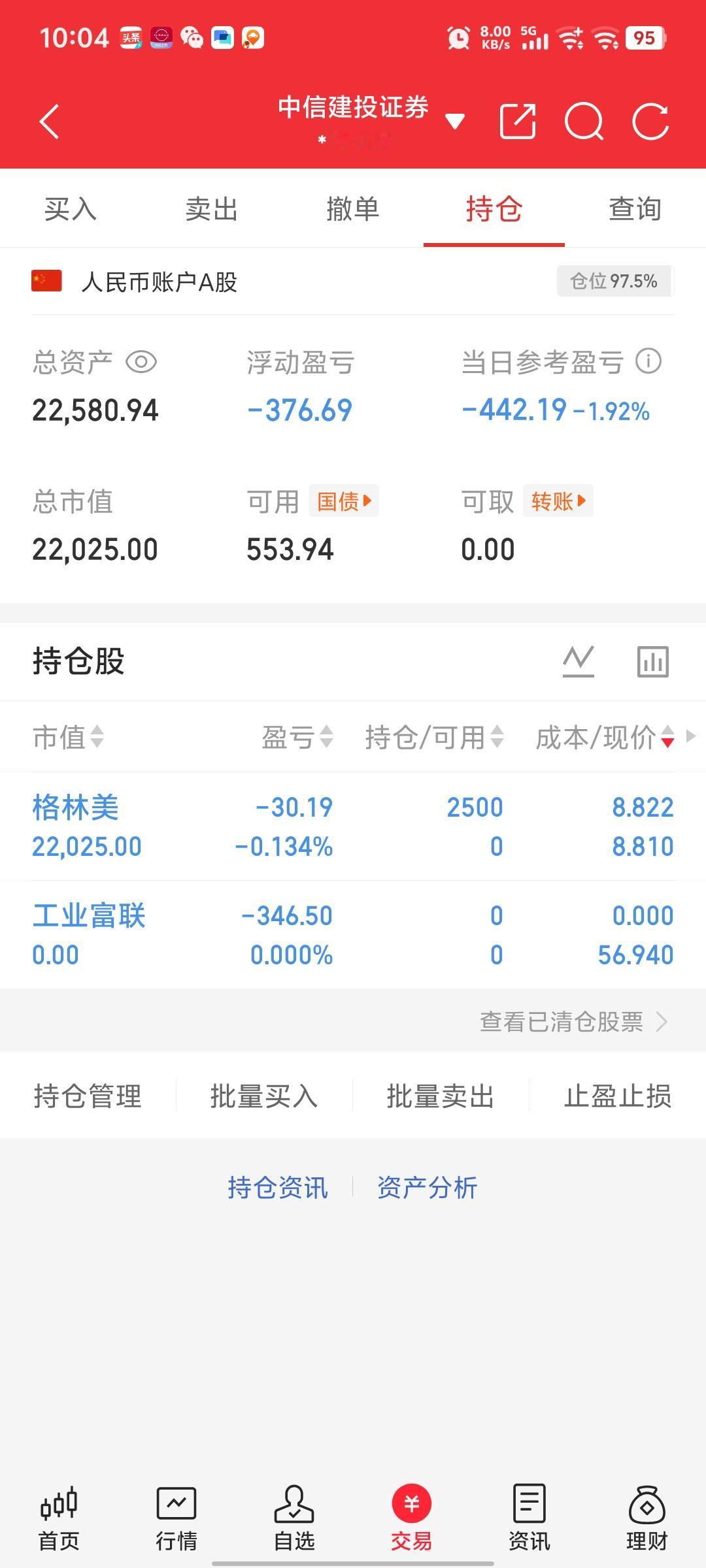 把工业富联、通达股份、南方精工都清了,孤注一掷格林美。