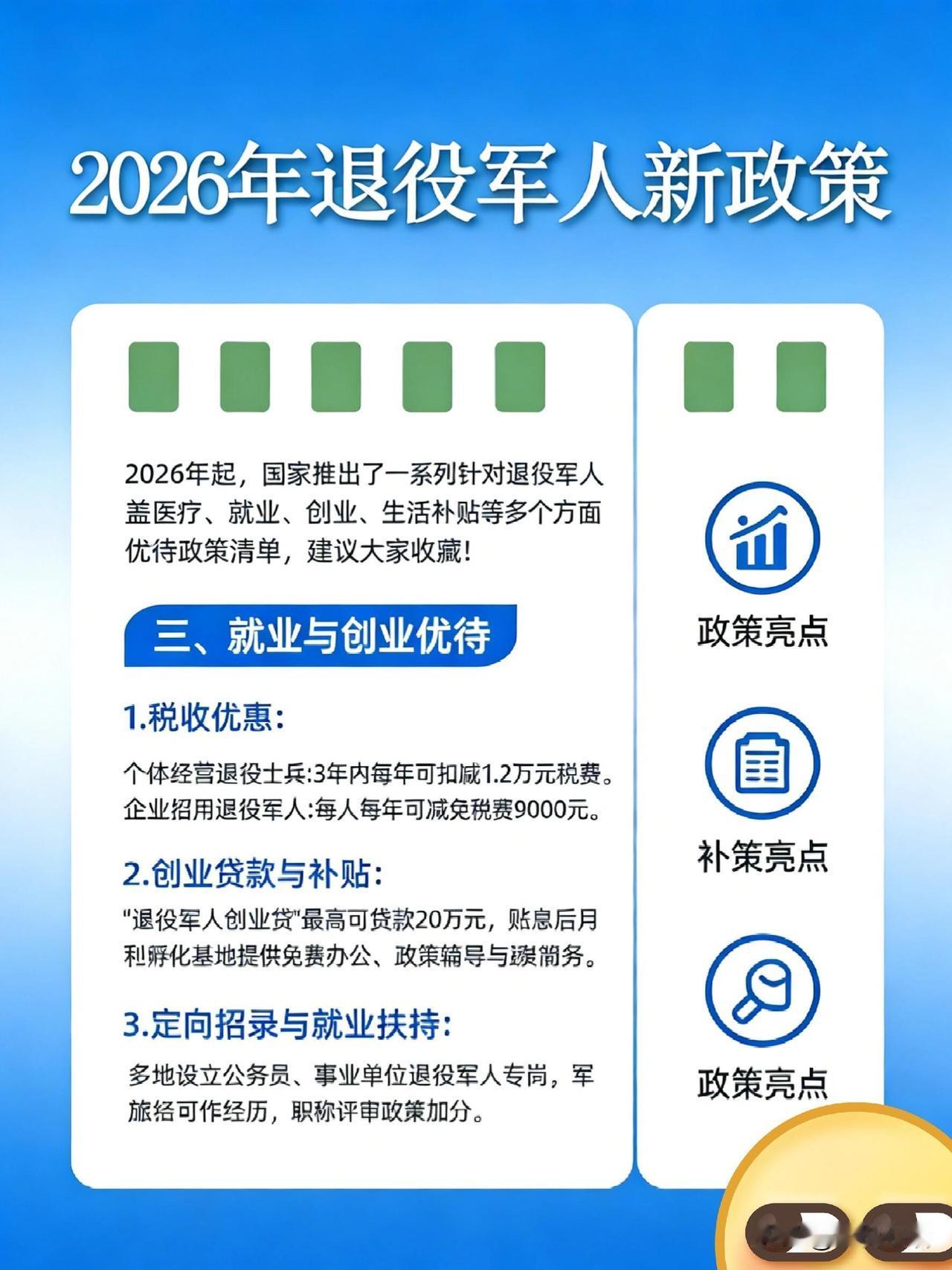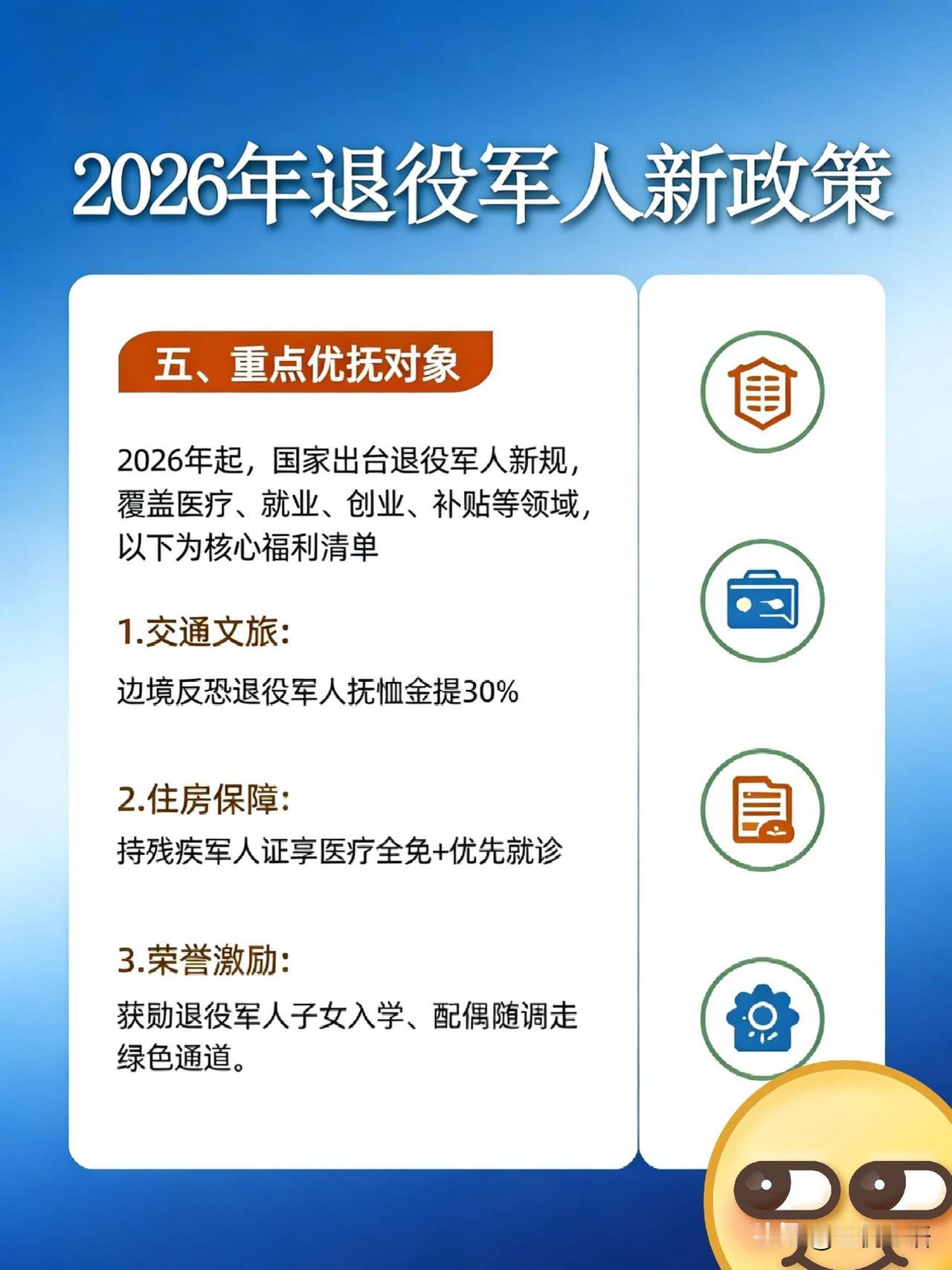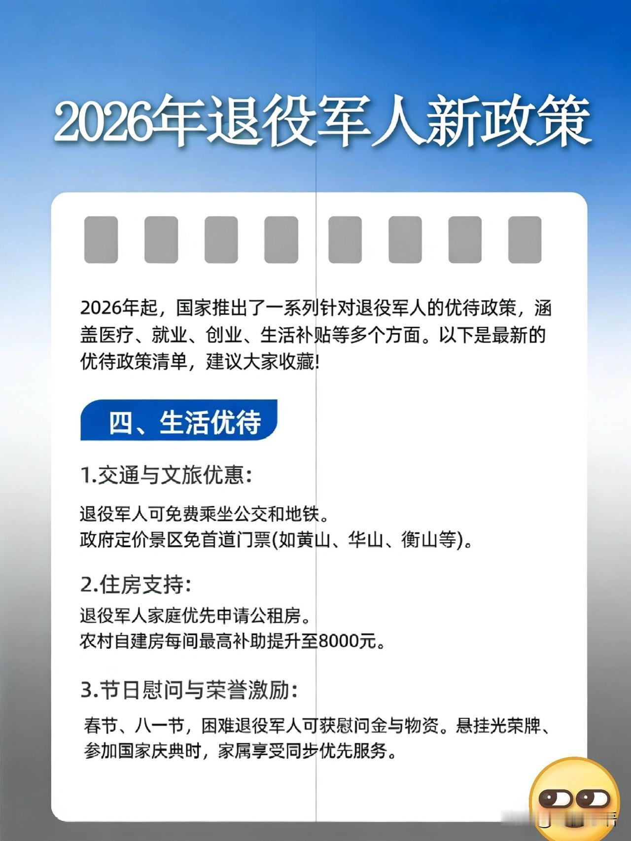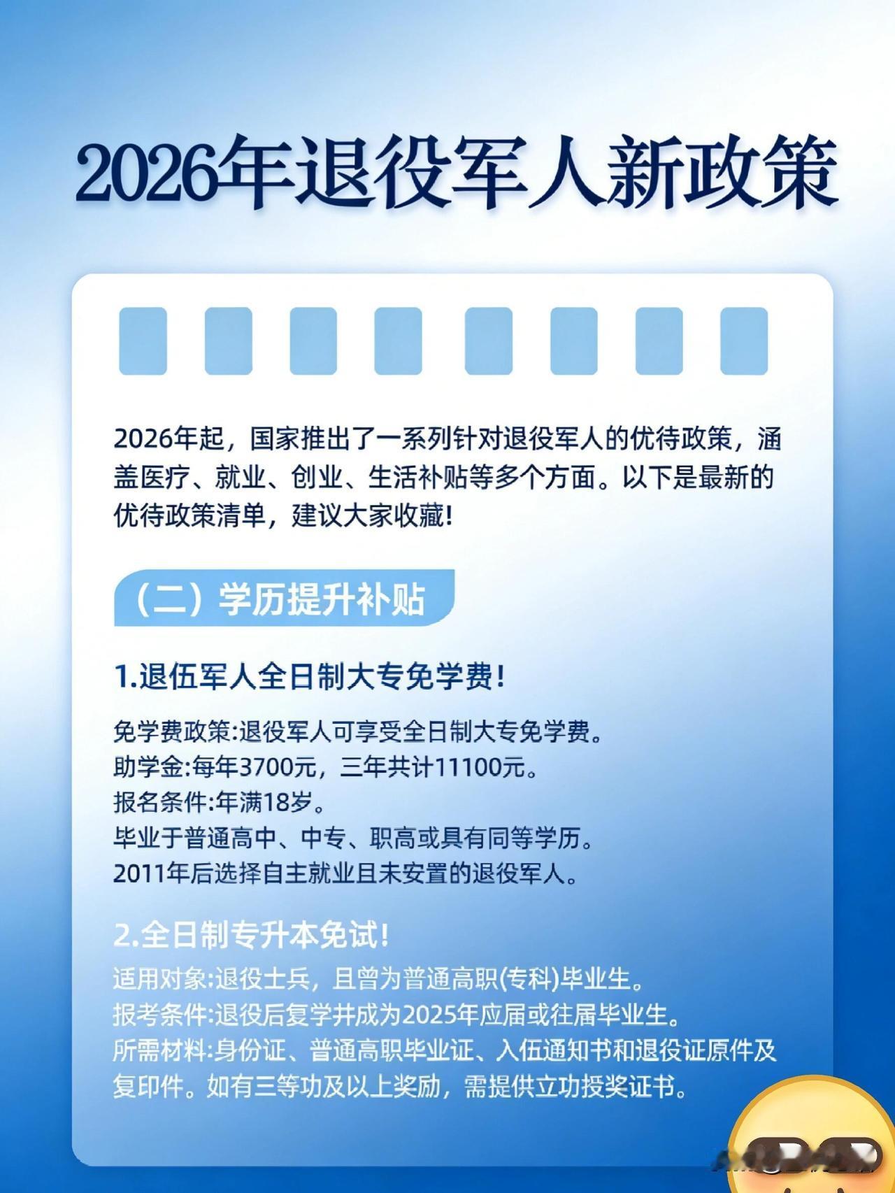 2026退伍军人新福利,别错过! 战友们快看! 2026年退役军人福利太顶了! 医疗直接减负, 门诊住院都能减, 家属还能享优惠, 医院有专属绿色通道。 想提升学历的有福了, 全日制大专免学费, 每年还有3700助学金, 专升本直接免试。 创业就业给足支持, 税收减免、最高20万创业贷, 公务员还有专岗。 交通文旅超给力, 公交地铁免费坐, 知名景区免首道门票。 住房、节日慰问也都安排上, 退伍证真的用得上了! 国家没忘了咱们的付出, 这些福利必须收藏转发, 告诉身边的亲人战友! 退伍老兵待遇
