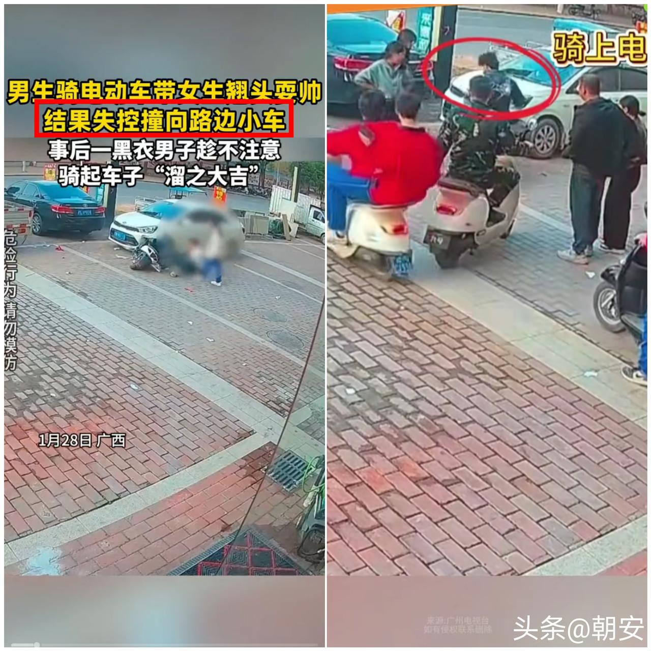 太糊涂了! 广西小伙骑电动车载着女生街头翘头耍帅,帅不过三秒直接撞车,后续操作更是让人火大。 为了虚荣心在公共道路上炫技,完全把安全抛在脑后。 电动车翘头本身就失去平衡,载人行驶风险加倍,失控撞向路边车辆,不仅自己摔伤,还让无辜车主蒙受损失。 更离谱的是,事发后女生匆匆离场,还有人赶来直接把肇事车骑走,试图逃避责任,没有一点担当。 现在很多年轻人把危险当个性,把违规当炫酷,马路变成个人秀场。 殊不知交通规则不是约束,而是保命底线。 一时的耍帅风光,换来的是财产损失、人身受伤,甚至要承担法律责任,得不偿失。 真正的帅气从来不是铤而走险的特技,而是守规矩、有责任心、敬畏生命。 别拿无知当个性,平安出行才是最高级的体面。 你在路上见过这类危险耍帅行为吗?