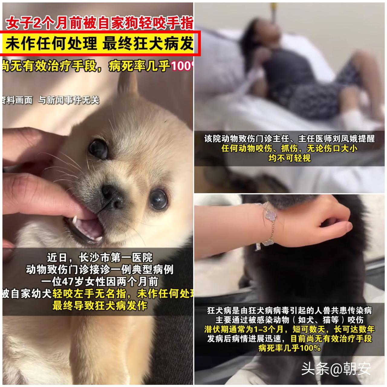 意外还是发生了! 千万别拿自家宠物当借口,忽视看不见的致命风险。 长沙一位女士逗自家小狗时,手指被轻咬一下,没破皮没流血,她觉得自家狗狗干净健康,完全没放在心上,既没冲洗伤口也没就医。 可短短两个月后,她突然发烧、伤口刺痛,还出现怕风怕水的症状,最终确诊狂犬病发作,让人无比惋惜。 很多人都有一个误区,觉得只有明显流血、伤口很深才需要处理,自家养的宠物就绝对安全。 事实上,狂犬病毒可以通过肉眼难以察觉的微小破损、黏膜侵入人体,外表健康的动物,唾液中也可能携带病毒。 狂犬病一旦发作,几乎没有救治可能,所有的侥幸,都可能酿成无法挽回的悲剧。 不管是猫狗抓伤还是咬伤,哪怕只是轻微触碰,都要第一时间用肥皂水和流水交替冲洗伤口,再及时就医评估处置。 生命没有重来的机会,防范意识一刻都不能松懈。 你被宠物抓伤咬伤后,都会第一时间规范处理吗?狂犬病