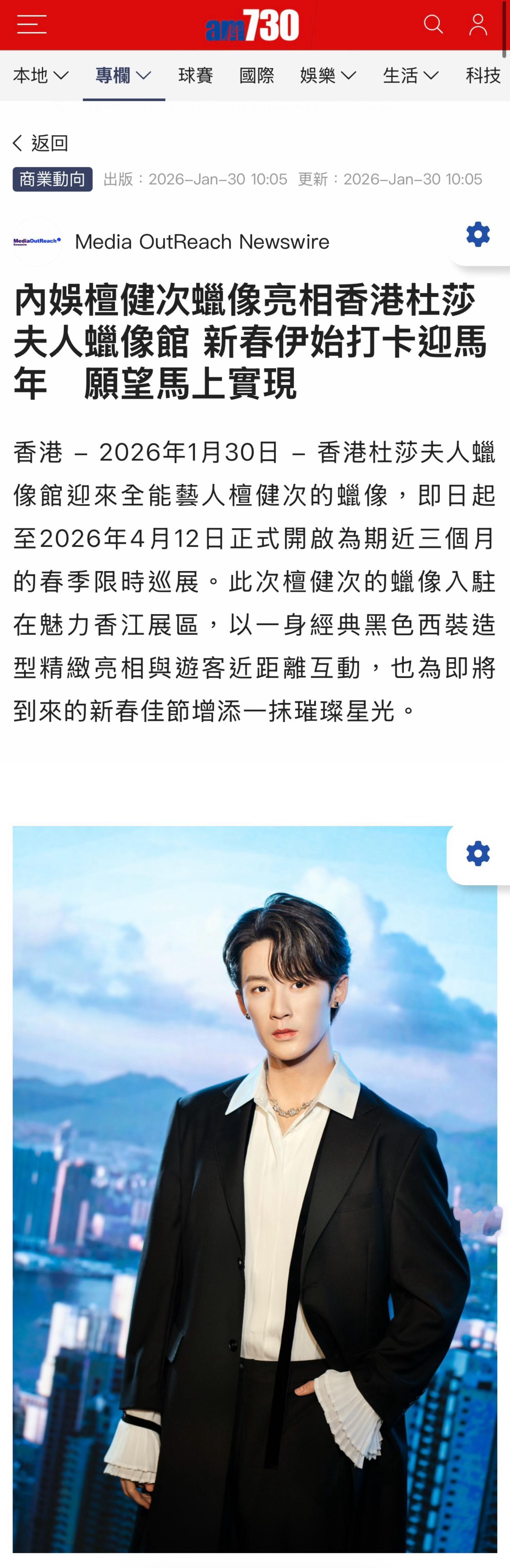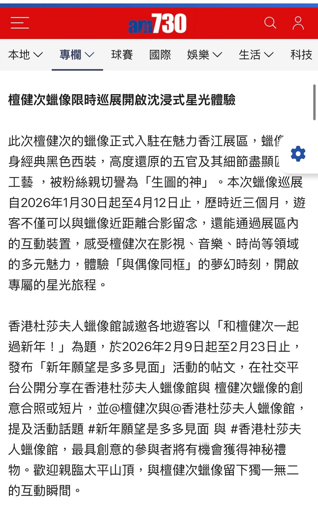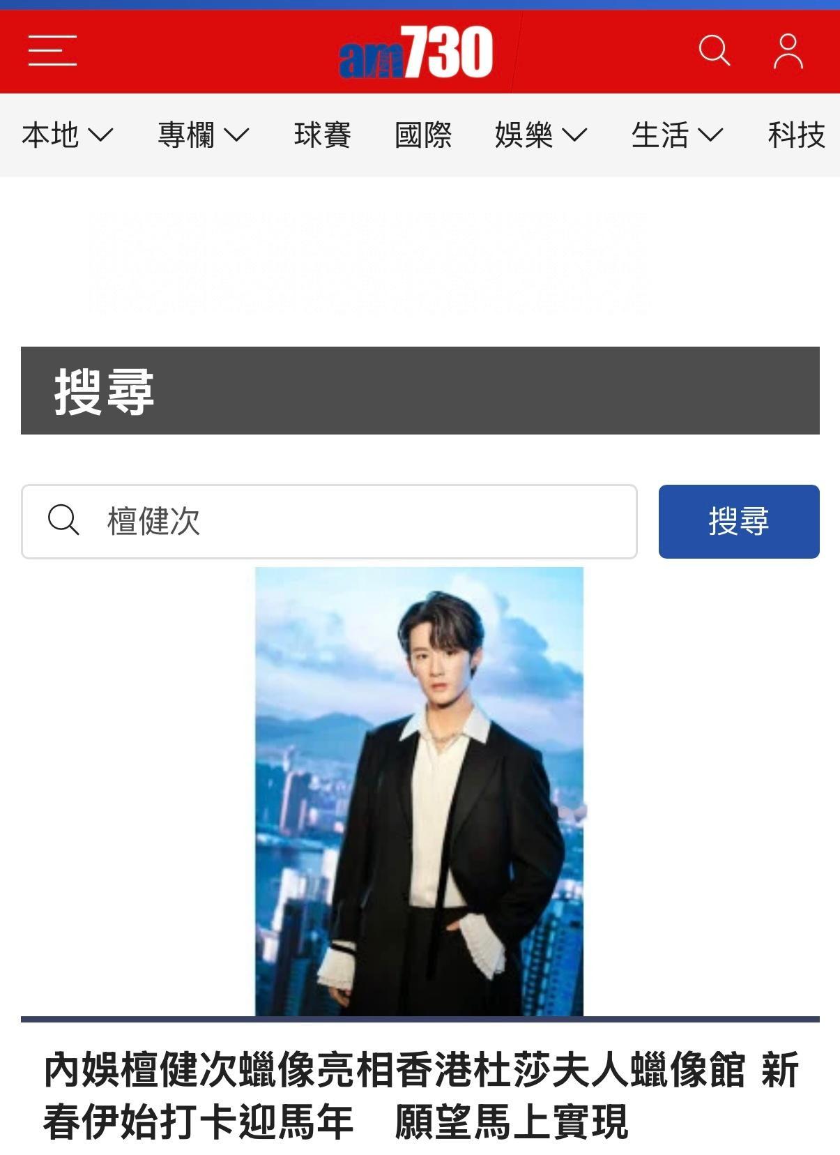 香港报纸报道:内娱檀健次蜡像亮相香港杜莎夫人蜡像馆