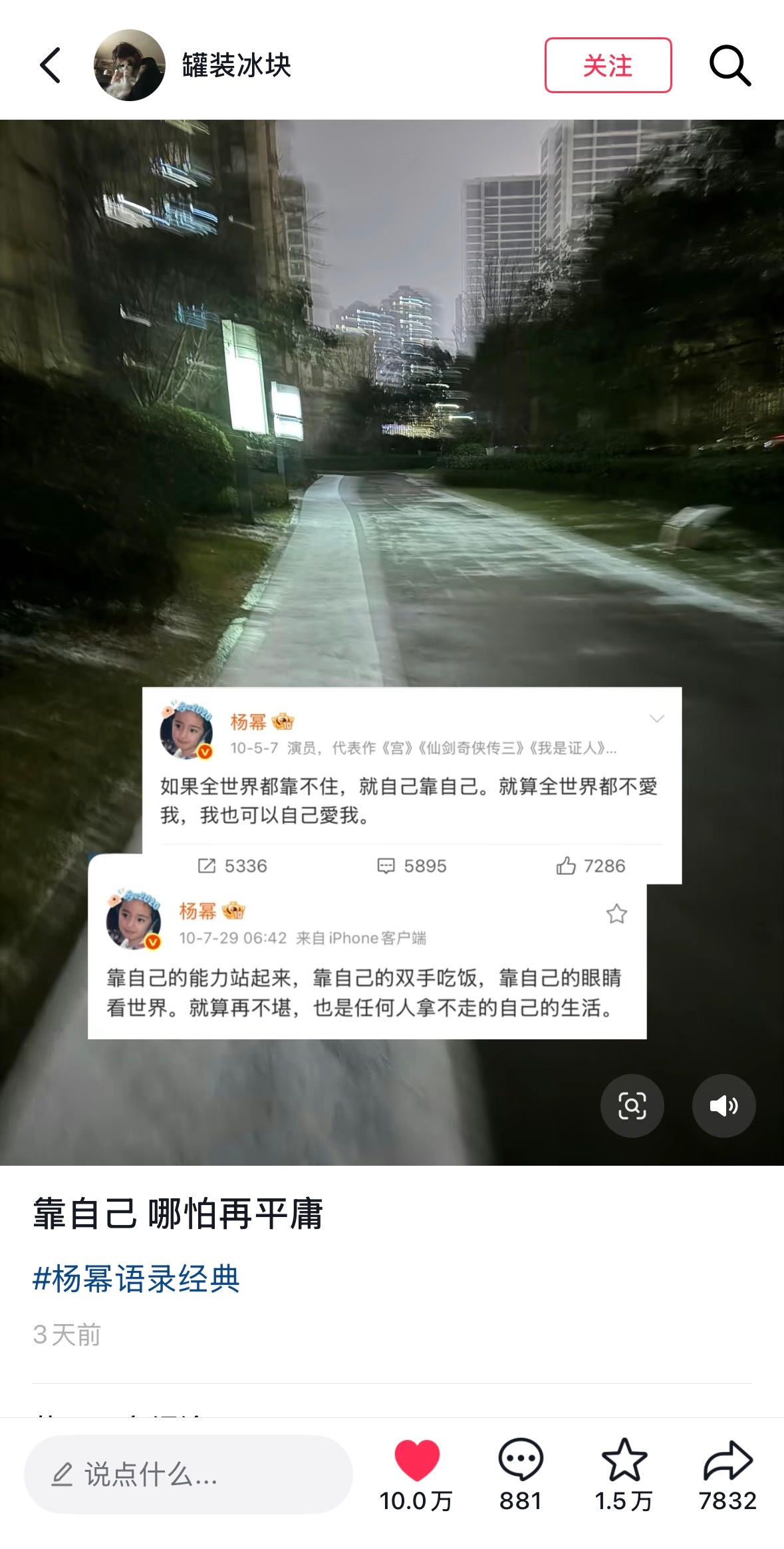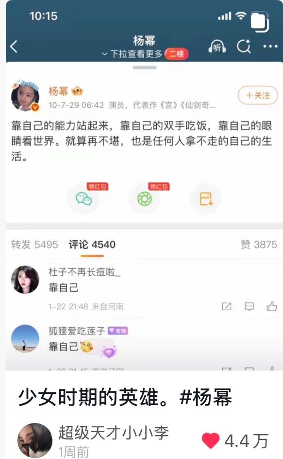 杨幂 我少女时期的英雄杨幂的作品角色陪伴了很多人的青春杨幂的语录、杨幂的人生经历鼓舞了很多人成长我想这就是偶像的力量,是我的英雄