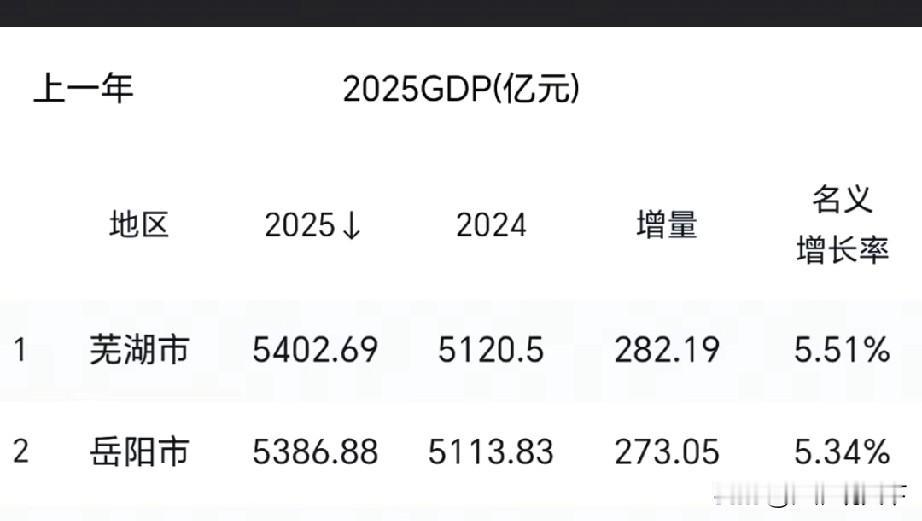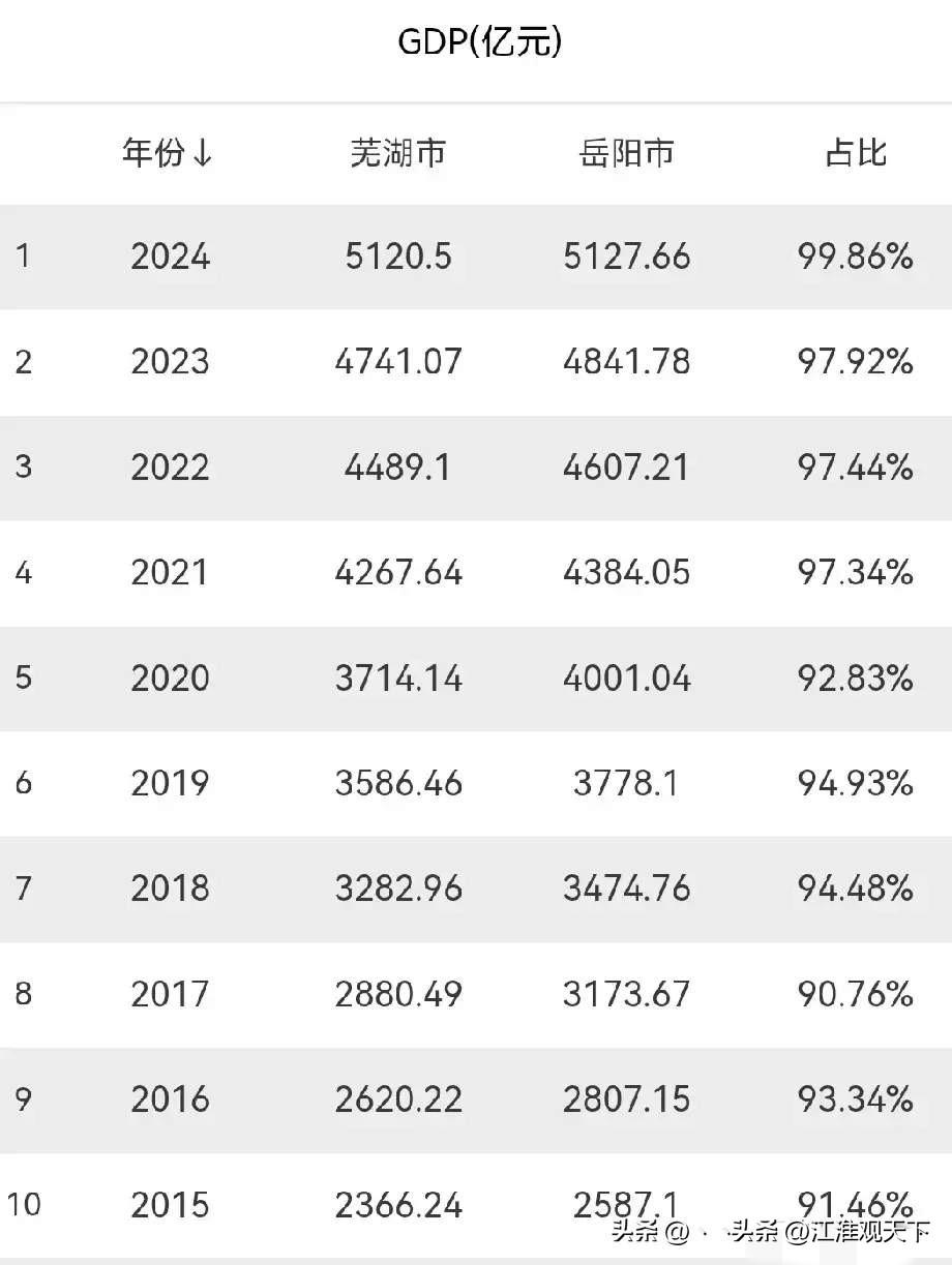 芜湖历史性的第一次超越岳阳,真的非常难得 提起岳阳,很多人都知道,范仲淹那首大名鼎鼎的《岳阳楼记》,写的就是岳阳, 这篇经典文章中有句话:不以物喜,不以己悲;居庙堂之高则忧其民;处江湖之远则忧其君。是进亦忧,退亦忧。大家依然能够记得背诵出来。 岳阳是长江流经湖南省的唯一地级市,风景优美,资源丰富。 岳阳是湖南省地级市,也是湖南省副中心城市,全市总面积15019.2平方公里,常住人口约499万人。 从2015到2024年这10年时间,湖南岳阳的gdp都是领先安徽芜湖市,直到2025年,芜湖历史性第一次反超岳阳,芜湖市gdp为5402.69亿元,岳阳gdp为5386.88亿元。 城市发展就是需要你追我赶,同为长江边的城市,芜湖历史性的第一次超越岳阳,相信2026年,芜湖和岳阳会更加努力,一起共同进步。