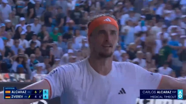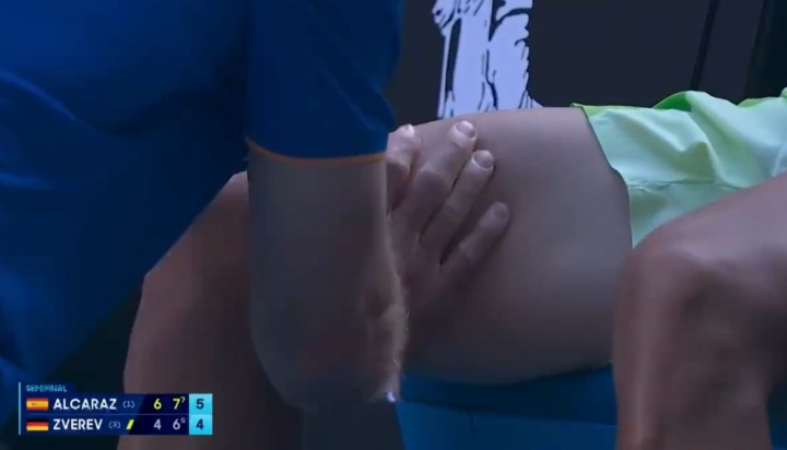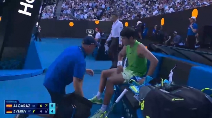 直播吧01月30日讯澳网男单半决赛阿尔卡拉斯vs兹维列夫进行到第三盘,阿尔卡拉斯申请医疗暂停,兹维列夫认为阿卡是抽筋,所以按照规定不能申请伤停治疗,一直在旁边和赛事监督抱怨这一情况。