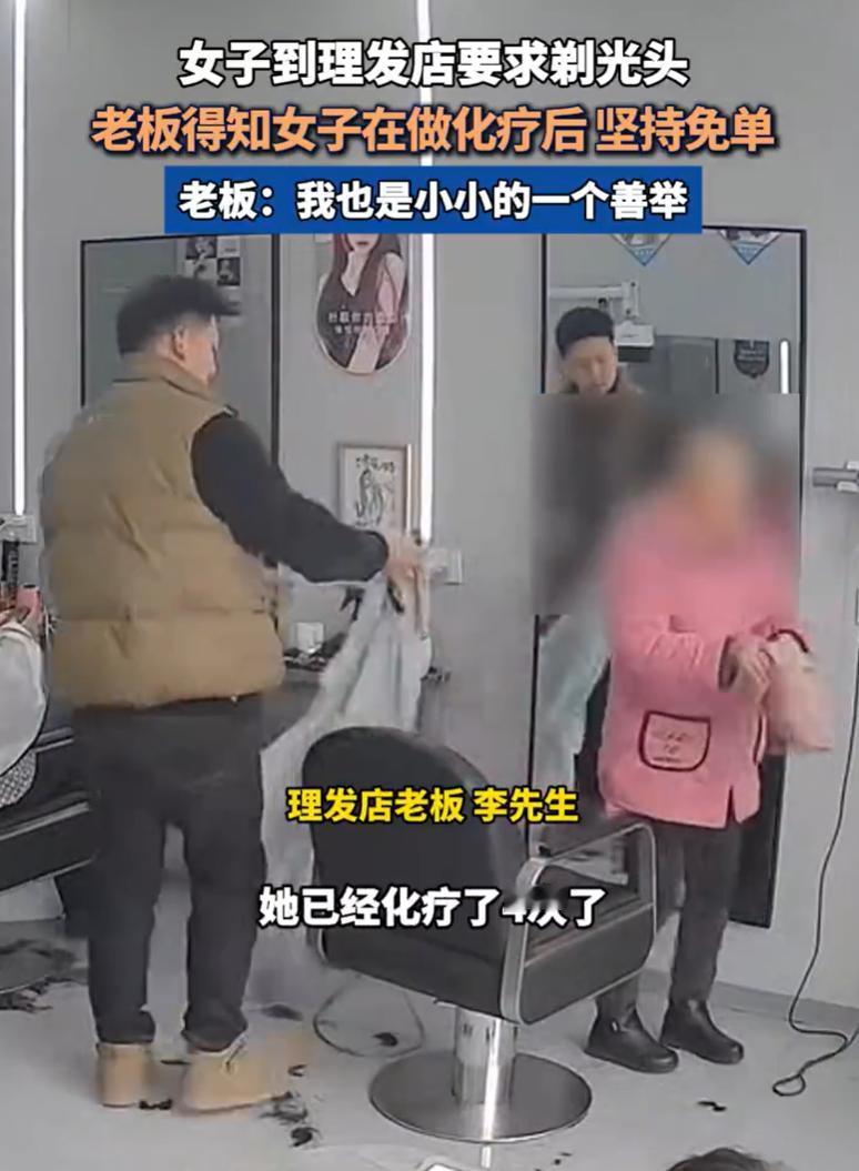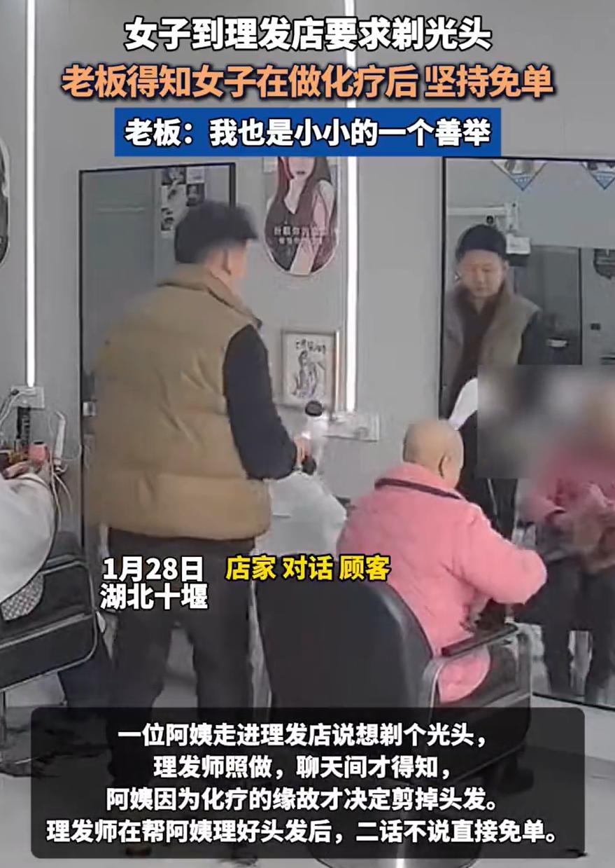 看哭了!湖北十堰,一位阿姨走进一家理发店,店家本以为阿姨是年底来烫头,结果却是剃光头的,店主在剪头时就好奇问了一下,可当他得知阿姨做了四次化疗后,直接表示:免单! 当天,店主李先生正招呼着客人,这时一位阿姨推门走了进来。阿姨看上去年纪不大,但脸色有些憔悴。她走到李先生面前,轻声说想剃个光头 李先生有点意外,毕竟快过年了,来理发店的女性大多是想烫个漂亮的发型,剃光头的实在少见。但他没多问,只是请阿姨坐下,围上围布,准备开始理发 推子嗡嗡响起,一缕缕头发落在地上。李先生手法很轻,一边理一边跟阿姨聊家常。他隐约感觉到,选择剃光头的人,多半是有些特殊原因,也许是身体不舒服,也许是其他难处 聊着聊着,阿姨轻声说出了实情。原来她正在接受化疗,这已经是第四次了。化疗导致头发大把脱落,与其看着头发一缕缕掉光,不如干脆剃光,心里反而好受些 李先生手上的动作顿了一下,心里突然像被什么揪住了。他继续仔细地帮阿姨理完剩下的头发,动作比之前更加轻柔。最后,他用海绵轻轻擦去阿姨颈后的碎发,解开围布 阿姨起身准备付钱时,李先生摆了摆手,很自然地说了句:这次就不收钱了,您保重身体 阿姨愣了一下,眼眶有点红,连声道谢后才离开 事后,李先生把这个事发到网上,他表示自己就是做了件小事。谁家里没个难处呢?能帮一点是一点。但行好事,莫问前程,没想过会被这么多人知道 生活在很多时候并不容易。每个人都在各自的困境中跋涉,有时是身体上的病痛,有时是其他难以言说的艰难。陌生人的一点善意,就像夜路里偶然亮起的一盏灯,虽然不能照亮整条路,但至少能让人知道,这段路不孤单 像李先生这样的普通人还有很多。可能是菜市场多送一把青菜的摊主,可能是看到你搬重物时顺手帮一把的邻居,可能是公交上默默让座的陌生人。这些细小的善意串联起来,就成了我们愿意相信生活、继续前行的理由
