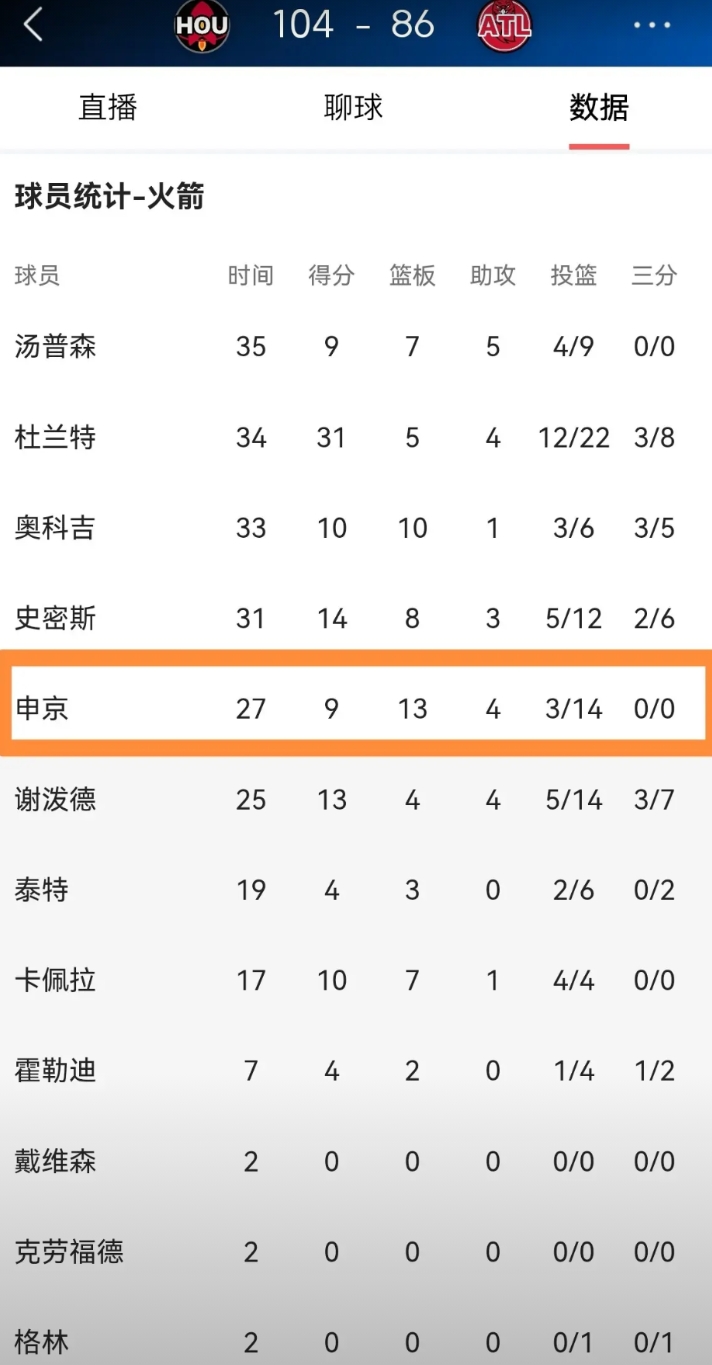 火箭当家中锋申京再次成为笑柄了!虽然今天火箭在客场以104:86轻取老鹰,但是申京在进攻端的表现却非常的挣扎,他的进攻效率简直低的可怜。