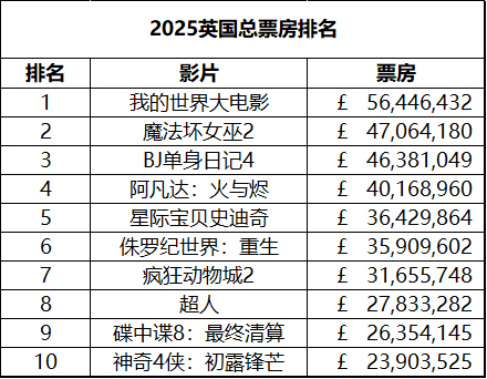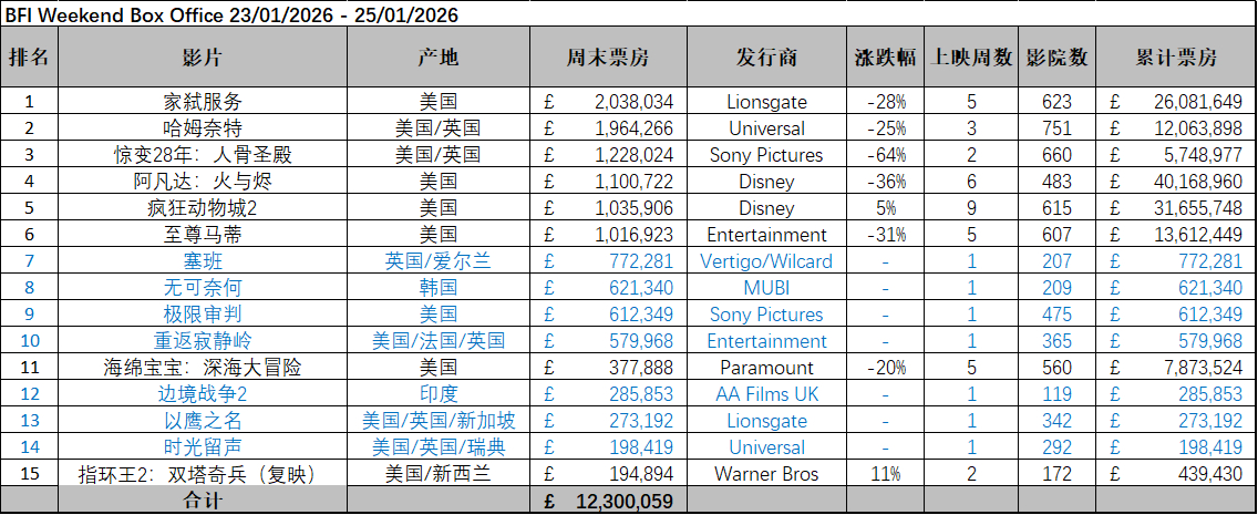 英国周末票房(1.23-1.25):1.《家弑服务》公映第5周重回冠军,累计票房2608万英镑;2.《阿凡达3》累计票房突破4000万英镑;3. 英国电影《塞班》在新片中表现最佳,《极限审判》《重返寂静岭》大扑。(数据:BFI)