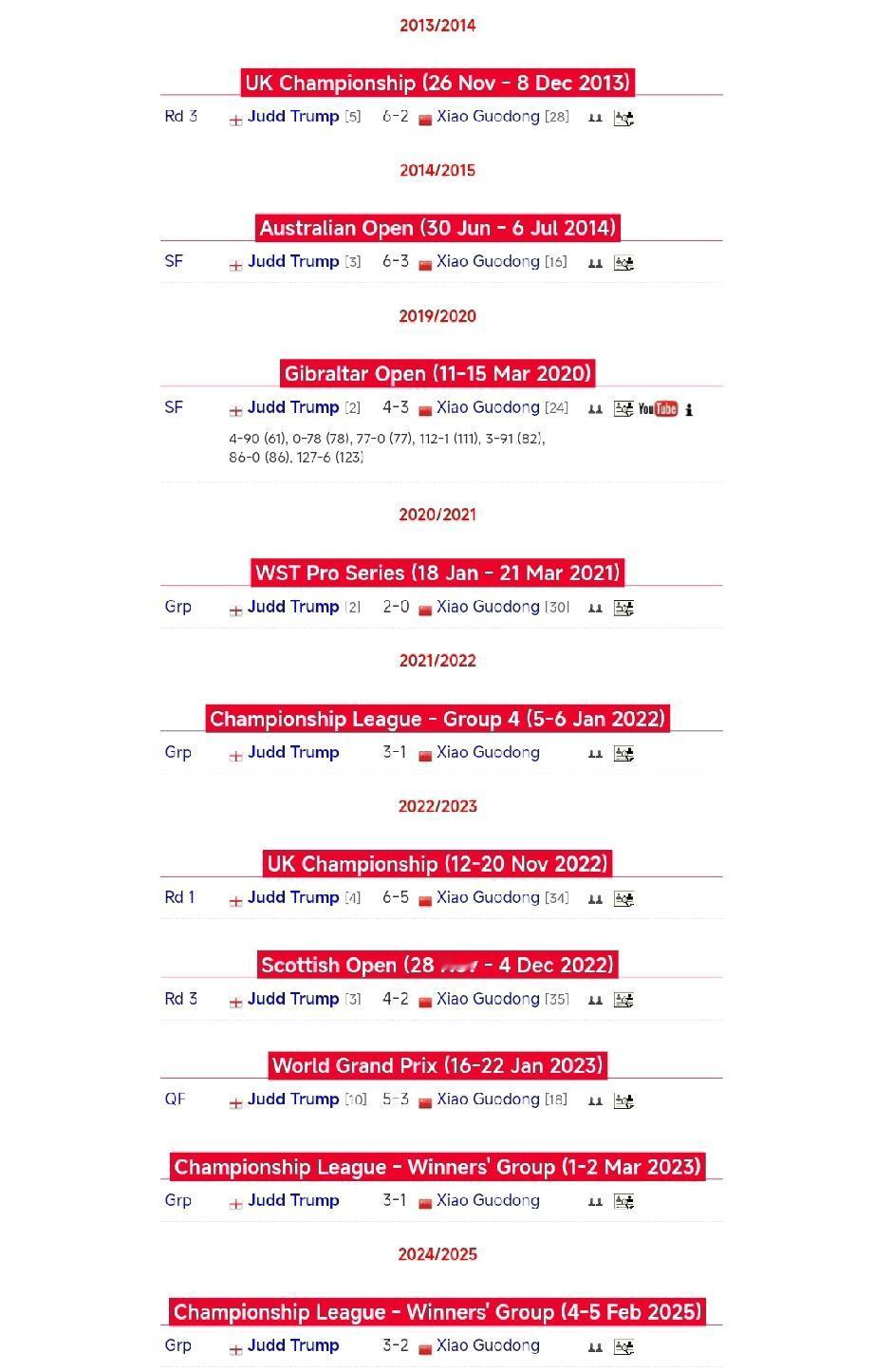 肖国栋极小概率战胜“克星”! 从2013年至今,肖国栋与贾德·特鲁姆普交手遭遇10连败。明天凌晨三点的德国大师赛1/4决赛,两人再次交手,肖国栋有机会吗战胜“克星”吗? 有获胜机会,但难度极大,特鲁姆普仍是明显占优的一方。 综合两人历史交手、近期状态和本场比赛关键因素分析,肖国栋的胜率预估在20%左右,需要超常发挥且抓住特鲁姆普的失误才有机会爆冷。