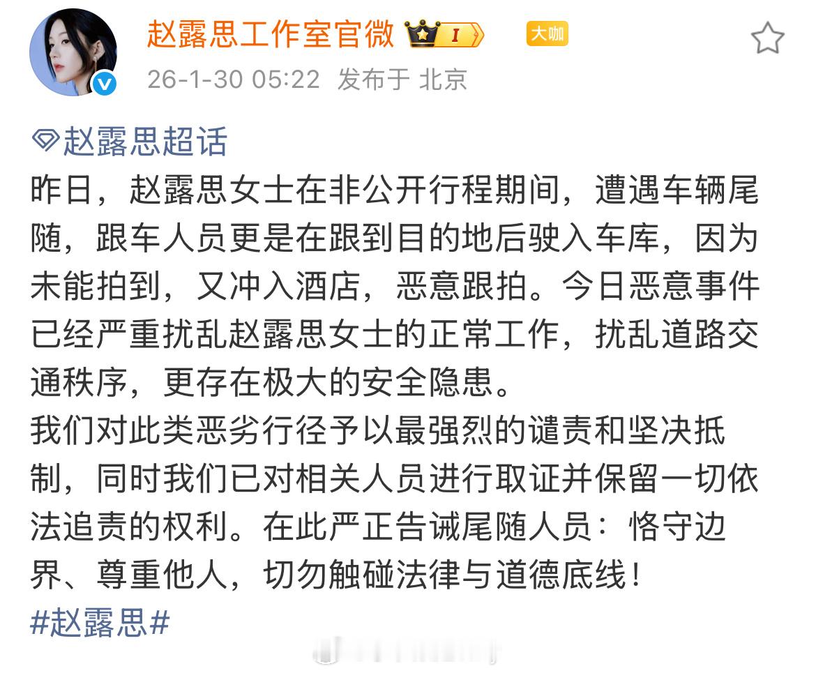 #赵露思工作室回应被尾随跟拍#【知名女演员被车辆尾随、冲入酒店跟拍,工作室回应: