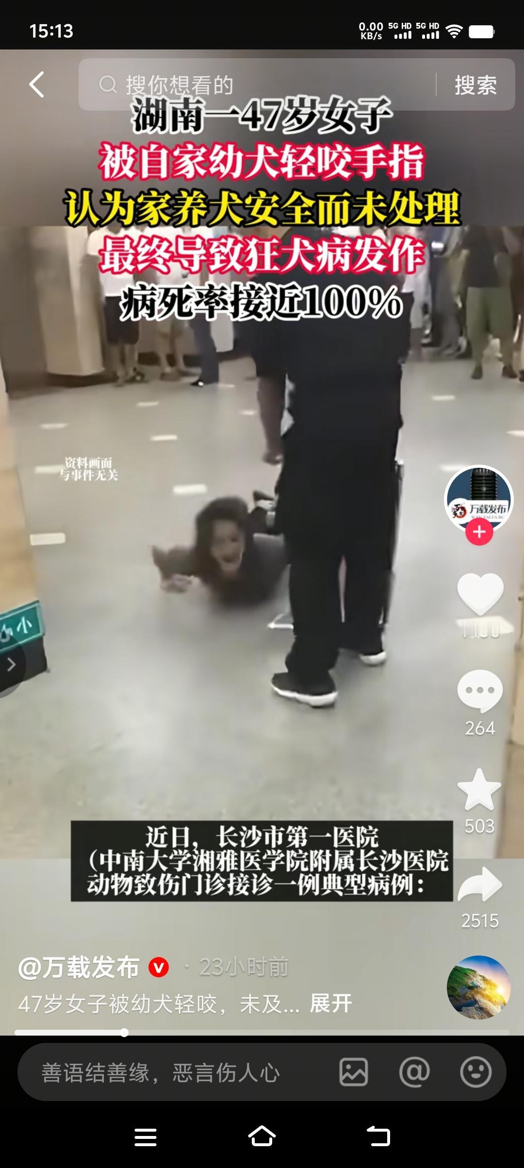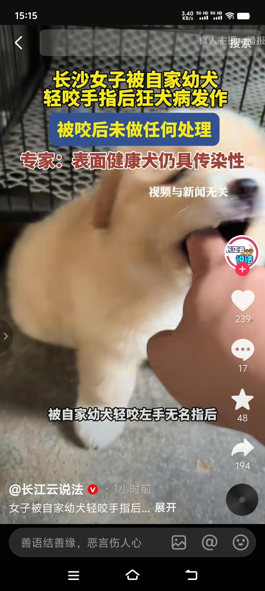 重要的事说三遍,只要被狗咬了,狗不论大小,伤口不论轻重,一律及时打疫苗,千万别拿概率赌百分之百的死亡率。 长沙47岁的女子被自家幼犬轻咬,可能是伤口很小,也可能是认为自己养的幼犬安全,所以事后没作任何处理。谁知道两个月后,出现狂犬病症状,最终不治身亡。 狂犬病死亡率百分之百,只有疫苗,没有解药。所以说大家一旦被狗咬了,千万不要拿概率赌自己的生命。