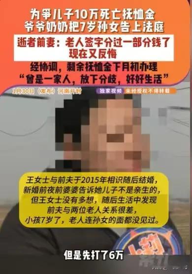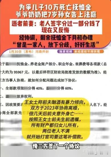 “金钱面前,亲情一文不值!”河南开封,女子受不了酗酒,还有暴力倾向的丈夫,就和他离了婚,结果没几天,前夫就意外离世了,留下一笔10万左右的抚恤金,女子和前公公婆婆商量好,自己的女儿大概拿6万,前婆婆大概拿4万,他们签了协议,事后,前公公婆婆却将孙女告上法庭,他们大概要拿6万元。 王女士看着酗酒,又有暴力倾向的丈夫,她又看着才7岁的女儿,内心非常痛苦。 这样的丈夫,她是一天也不想和他过下去了,可离了婚,就害了女儿,但不离婚,就害了她的一辈子。 她考虑了很久很久,也痛苦了很久,最终决定,不能迷失自己的人生,只有自己过好了,才能给女儿带来更好的生活,她和丈夫离了婚。 让她想不到的是,离婚才几天时间,前夫居然就出意外了,就这样离开了人世,只留下一封遗嘱,和10万元左右的抚恤金。遗嘱上写着,所有的财产归女儿所有。 有了这份遗嘱,王女士终于放心了,有了这10万元的抚恤金,她也能给女儿更好的生活。 事情却不如她所愿,前公公婆婆得知儿子的离世,有一笔10万元的抚恤金,他们找上门来了,要求分这笔抚恤金,为此,前公公拿干农活的钢叉,叉王女士,让王女士手上都是淤青。 无奈之下,王女士拿出遗嘱,两个老人不敢多说话,但他们表示,多少要分一点。 看着两个老人,也实在可怜,王女士便和他们协商,签下协议,同意分这笔抚恤金,其中她的女儿拿六成,钱公公放弃继承,前婆婆拿四成。 大家签好协议,也按照协议先分了6万,因为这6万是先转过来的,还有4万左右还没有到手。 本来按照这个协议,前婆婆拿到手里的钱大概是4万左右。 但后来,那4万左右的钱拿到手,王女士却接到了法院的传票,前公公婆婆居然把她的女儿给起诉了,要求重新分配这笔抚恤金,这10万元左右的钱,要求分三份,女儿一份,父亲一份,母亲一份。 如此算来,王女士的女儿应当拿到的钱是3万多元,前公公婆婆两人拿到的钱应该是6万多元。 可是按照这样的分法,就违背了他们之前签的协议,更何况王女士的前夫是有遗嘱的,所有的财产是留给他女儿的,本来前公公婆婆就不能分走一分钱的。 现在前公公婆婆居然起诉她女儿,王女士当然不同意,这笔钱是用来养育她女儿的,她不能让前公公婆婆拿走她女儿的成长费用。 也到了这一刻,她才真正地看清了前公公婆婆的嘴脸,这个时候她更是想起了一件事情,才明白为何公公婆婆会如此贪婪。 原来就在她新婚的前夜,前婆婆就跟王女士说,王女士的丈夫不是她亲生儿子。 当时王女士并没有想太多,反正自己也是成年人,跟她过日子的是自己的丈夫,又不是前婆婆,她并没有把这件事放在心上。 只是后来,她才发现,前夫和前公公婆婆的关系真的非常糟糕。 王女士生了女儿,女儿都7岁了,前公公婆婆连孩子的面都没有见过,可以说,不单是王女士的前夫对这两个老人没有感情,就连王女士和女儿,与这两个老人都没有什么感情。 现在为了钱,这两个老人是彻底地不顾亲情了,居然起诉自己的孙女,既然两个老人都不愿意念及亲情,王女士自然也不愿意把钱给老人,双方对簿公堂。 那么这笔钱该怎么分呢? 首先,王女士的前夫留有遗嘱,遗嘱已经明确说明财产留给女儿,那么这笔抚恤金应当分给王女士的女儿。 《民法典》第1123条规定:继承开始后,按照法定继承办理;有遗嘱的,按照遗嘱继承或者遗赠办理;有遗赠扶养协议的,按照协议办理。 在这种情况下,王女士只需要证明遗嘱是有效的,在遗嘱有效的情况下,可以不给前公公婆婆分这笔抚恤金。 其次,前公公婆婆出尔反尔,不讲诚信,不利于家风建设。 《民法典》第1043条规定:家庭应当树立优良家风,弘扬家庭美德,重视家庭文明建设。 既然大家都已经签过协议,约定好孩子拿六成,前婆婆拿四成,那么就应当按照协议进行。 现在,前公公婆婆起诉孙女,这行为非常伤感情,王女士有权不给前公公婆婆分钱。 不过经过协商,前婆婆愿意按协议分钱,王女士也愿意放下分歧,按照协议进行。 那么你对老人的做法有何看法?