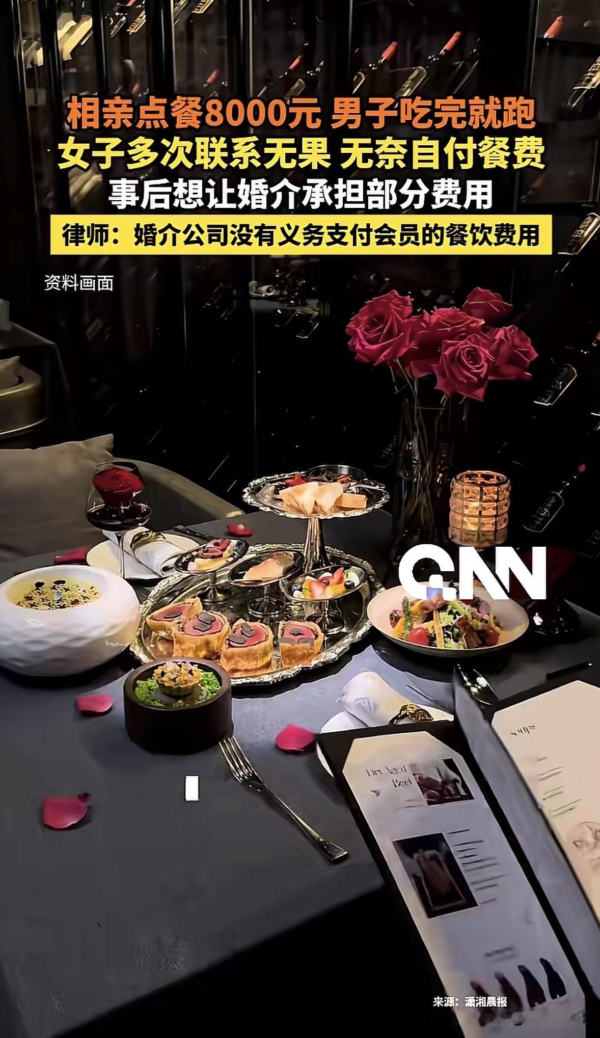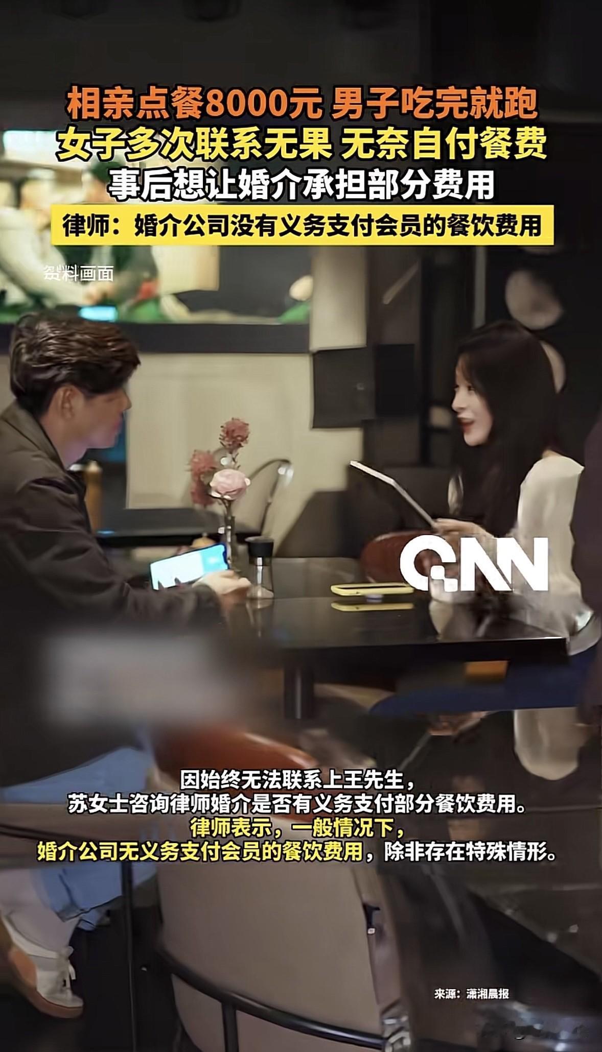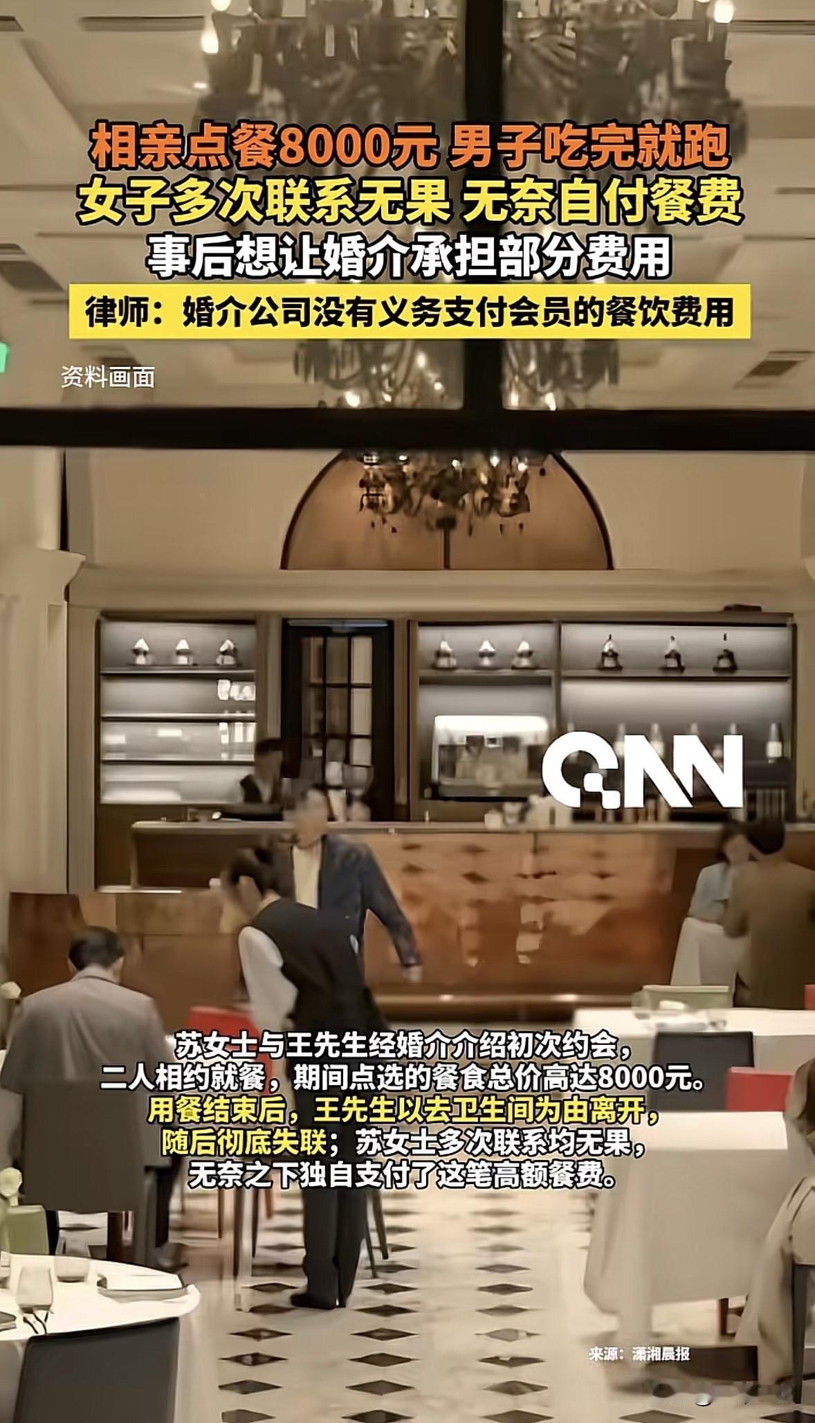北京,一女子相亲,和男子约在高档餐厅见面,一顿饭吃了8000块,可就在要结账时,男子竟借口上厕所,溜了!女子只能咬碎了牙往肚里咽,把这8000块给付了,事后她不甘心,认为婚介公司应该把这钱给她报了,女子咨询律师该怎么办,得到的答复让她无奈。 苏女士年纪也不小了,家里催得紧,自己也着急。 为了能找个靠谱的对象,花了不菲的会费注册了一家婚介机构。 没过多久,婚介红娘就热情地给她推了个优质男,王先生。 对方照片上看着斯斯文文,条件也不错,苏女士心里相当期待,心想这次还真有可能就成了。 两人约在了一家看着挺上档次的餐厅见面。 初次约会,两人点菜的时候也是毫不手软,专挑贵的点,什么海鲜、牛排,再开瓶好红酒,显得特别有排面。 虽然原文里也没交代具体是谁点的,反正这一大桌下来,得花不少钱。 苏女士暗中观察,这王先生看着条件不错,可能平时消费水平就挺高的。 想到这,苏女士更满意了。 这顿饭吃得是宾主尽欢,至少表面上是这样。可就在结账的当口,戏剧性的一幕来了。 王先生突然捂着肚子,说不好意思,我得先去趟卫生间,肚子有些不舒服。 苏女士也没多想,说那你快去吧,我在这儿等你。 哪想到,这一等,她再也没等到人。 苏女士坐在那儿刷了半小时手机,也没见王先生回来。她赶紧给王先生发消息,打语音,可对方就跟看不见似的,不回也不接,彻底失联了。 这下,一种不祥的预感涌上苏女士的心头……这该不是遇上饭托或者是专门蹭饭的骗子了吧? 她赶紧叫来服务员买单。这不看不知道,一看吓一跳,这顿饭吃了8000块! 看着那一长串的账单数字,苏女士的手都在抖。这可是她好几个月的工资啊!就这么被一个只见了一面的男人给坑了? 苏女士气的,眼泪都在眼眶里打转,但在众目睽睽之下,为了不被当成吃霸王餐的,她只能咬碎了牙往肚里咽,含着泪把这8000块钱给付了。 出了餐厅门,冷风一吹,苏女士越想越委屈。 这王先生就像人间蒸发了一样,婚介登记的电话也打不通。 无奈之下,苏女士想到了找律师咨询,她觉得婚介机构收了钱,总得对会员负责吧?这8000块钱,婚介是不是得赔点? 然而,从法律角度看的话,这钱,婚介大概率是不用赔的。 为啥?因为婚介的职责是“牵线搭桥”。人家的义务是核实一下王先生是不是真人、有没有犯罪记录、是不是单身,只要这些基本信息没造假,婚介的活儿就算干完了。 至于你们俩见面后是去吃沙县小吃还是去吃满汉全席,这是你们自己的社交行为,花多少钱那是你自己愿意掏的,婚介没法未卜先知,更管不着你的钱包。 《民法典》第962条规定:中介人应当就有关订立合同的事项向委托人如实报告。中介人故意隐瞒与订立合同有关的重要事实或者提供虚假情况,损害委托人利益的,不得请求支付报酬并应当承担赔偿责任。 婚介公司与苏女士之间成立中介合同关系。 婚介机构的法定义务仅限于如实报告与订立合同相关的重要事实,比如核实身份、婚姻状况等。 只要婚介公司对王先生的基本身份信息进行了形式上的合理审核,未发现其有诈骗前科或使用虚假身份,且不存在与王先生恶意串通骗取餐费的情形,即视为已履行法定义务。 苏女士支出的8000元餐费属于其与王先生在社交过程中的自主消费行为,并非婚介服务直接导致的必然损失,与婚介公司的中介行为之间不存在直接因果关系。 所以说,除非苏女士能证明婚介公司存在故意隐瞒重要事实或者提供虚假情况,比如明知王先生是饭托而不告知啊否则婚介公司无需对苏女士的餐费损失承担赔偿责任。 这8000块钱属于苏女士和王先生之间的个人债务。说白了,是王先生欠苏女士这顿饭钱,或者说是不当得利。 苏女士真正该找的冤大头是王先生本人,而不是婚介公司。 当然,除非苏女士能拿出铁证,证明婚介跟王先生是一伙的,俩人合起伙来设局诈骗,或者婚介连王先生的身份证都没核实,导致这人根本就是个虚假身份,让苏女士连告都没地儿告去。 只有在这种婚介存在重大过错的情况下,婚介才可能需要承担一点点补充赔偿责任。但也不可能全额买单。 如今啊,这苏女士心里是哇凉哇凉的。 有人说,如果8000块钱餐费是女方点的,男方离开我非常支持!如果是男方点的,建议女方直接报警。 对于这件事,你怎么看? 欢迎关注@一案一论