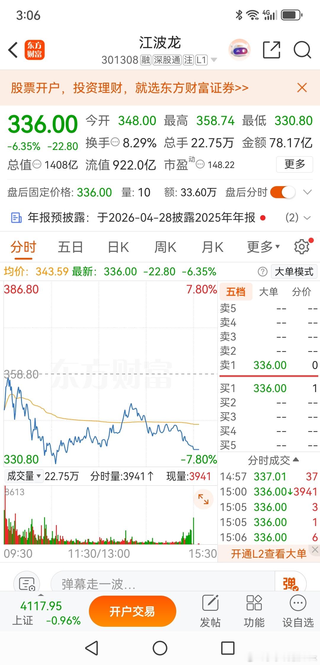江波龙,新的一轮下跌开始了江波龙,这一波的存储芯片涨价,人家还是涨的不错的,但是在股价创出历史新高后似乎出现了步履阑珊的感觉。江波龙,早盘低开回补缺口后,就展开了一波快速的下跌,最低下跌接近8个点,收盘是以今天的次低点保守。有朋友说,早盘股指下跌了接近80个点,跳水是很正常的?你要是这么理解,可能就要上当了,因为早盘的杀跌对象是贵金属、有色周期股,不是大科技。在下午股指回升的时候,大科技是一马领先的,在这种背景下,江波龙也仅仅是跌幅缩小到3个点而已,全天都没有红过。江波龙,今天的这根阴线,直接跌破了支撑股价的10日线,而且盘中的反弹很弱,所以我认为江波龙的下跌已经开始了。当然,是持续杀跌还是退二进一,主力说了算。欢迎加入我们的免费交流群财经股票