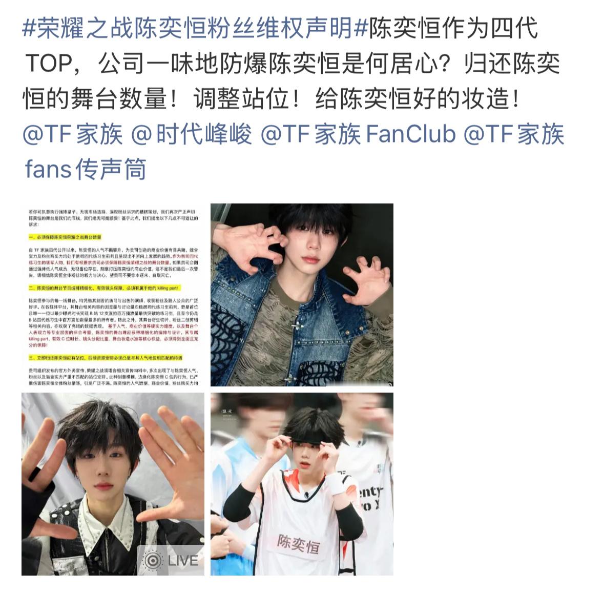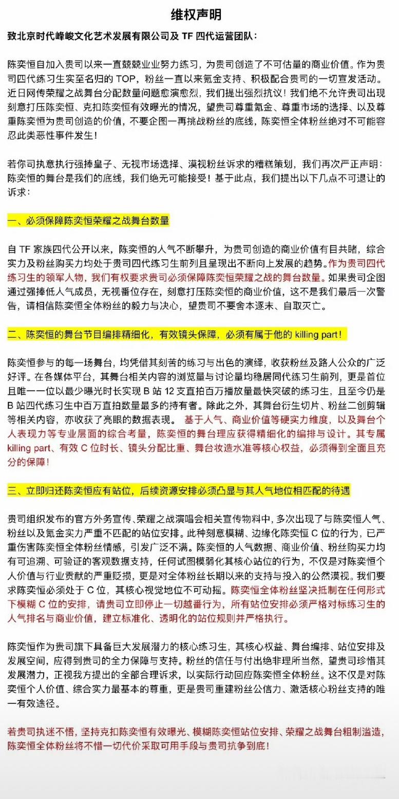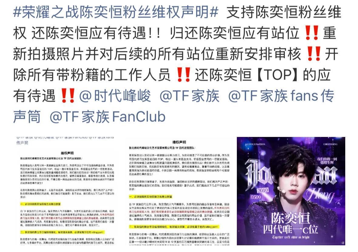 陈奕恒粉丝发布维权声明,要求公司归还站位。