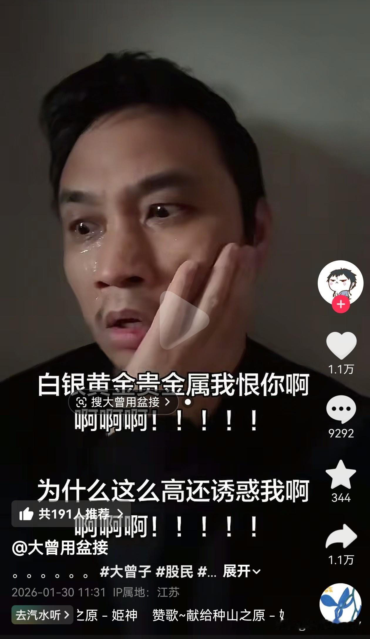 哈哈哈!1 月 30 日终于收盘了,第一时间点进大曾子的账号,今天没有意外,大曾子又被计提 3.2 万,他哭着说要把钱还给他,他不玩了。还怪有色金属诱惑他去接盘,哈哈哈,分明是他自己跑步进场的,现在又来说这样的话。 看到大曾子亏钱我们今天亏钱就不那么难受了,估计下周一大曾子不一定能跑出来哦,估计又要滴眼药水了[捂脸]大曾子