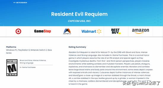 卡普空(Capcom)旗下的生存恐怖大作《生化危机9:安魂曲》(Resident Evil Requiem)近日正式通过了美国娱乐软件分级委员会(ESRB)的评级。 作为该系列的第9部正传以及系列30周年的纪念作品,本作被评为M级(17+,成熟女性/男性),其内容描述揭示了游戏极高的暴力尺度。 根据ESRB的官方清单,本作将登陆PC、PS5、Xbox Series X|S以及任天堂下一代主机Switch 2。评级报告中明确列出了“血腥、激烈的暴力以及强烈的粗口”等描述词,并提示含有“游戏内购买”内容。