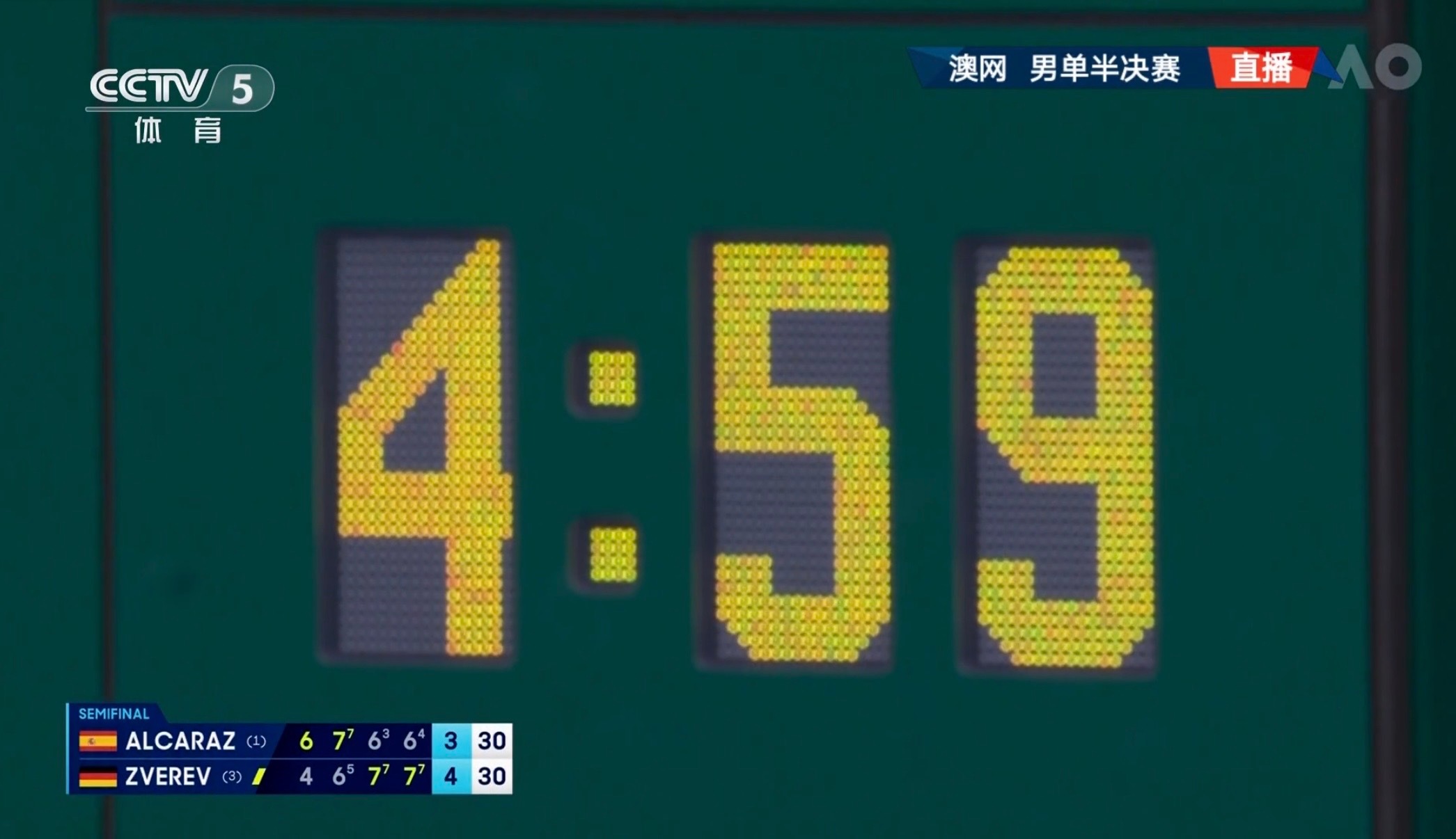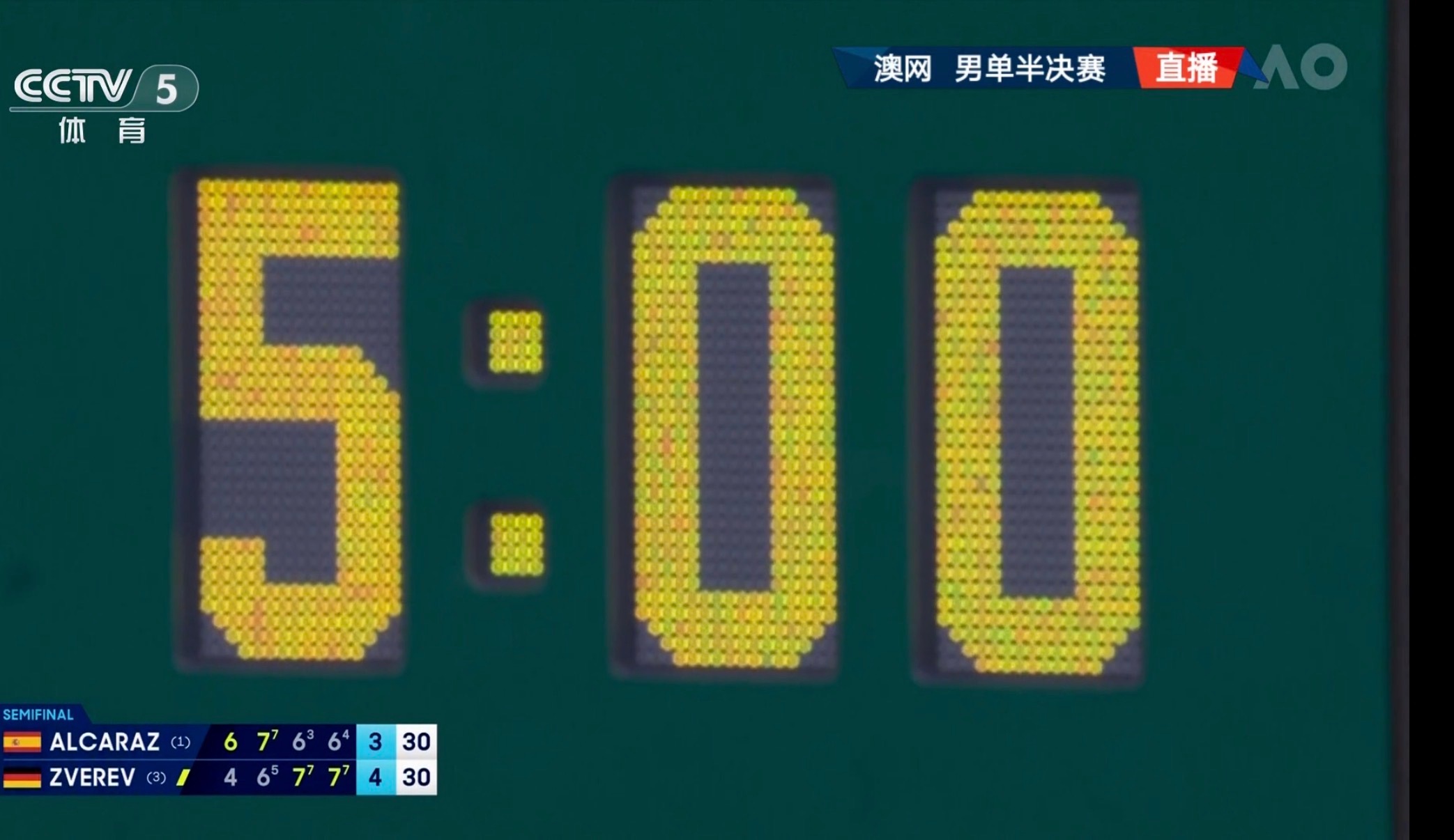 阿尔卡拉斯vs兹维列夫 阿卡错失两个破发点未能破发,决胜盘3-5,比赛迈进五小时大关!