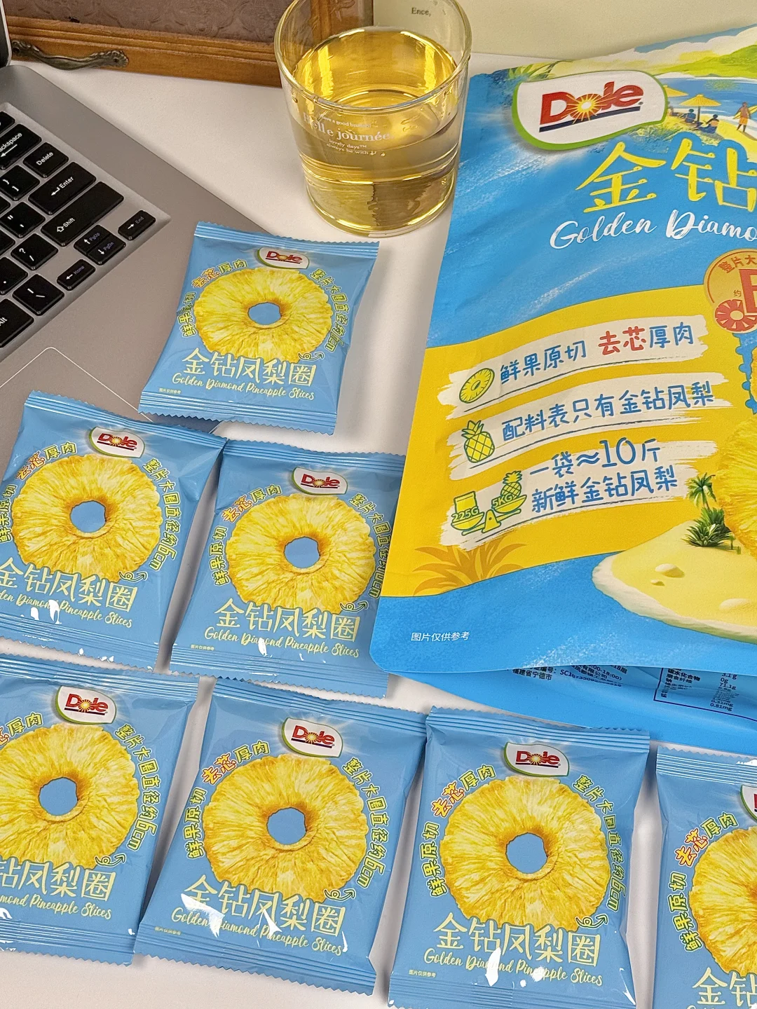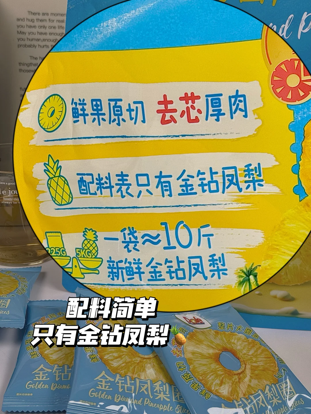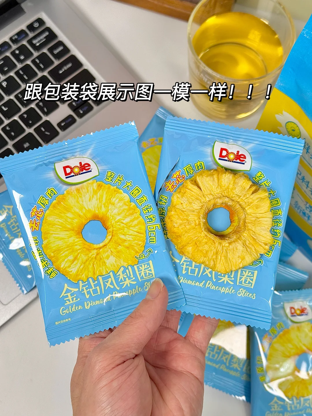 闲逛山姆没想到给我挖到宝藏零嘴 就是这个看起来平平无奇的都乐金钻凤梨圈 配料表巨干净,只有凤梨! 实物和包装完全没差,厚切大片无核,咬下去梗啾啾超有嚼劲 酸甜比例刚好,凤梨香气超浓郁 独立小包揣兜里,摸鱼解馋都合适!嗜酸星人闭眼冲! 而且凤梨圈+蓝莓+芝士+吐司,烤箱180度6分钟就能轻松实现凤梨芝士吐司自由!