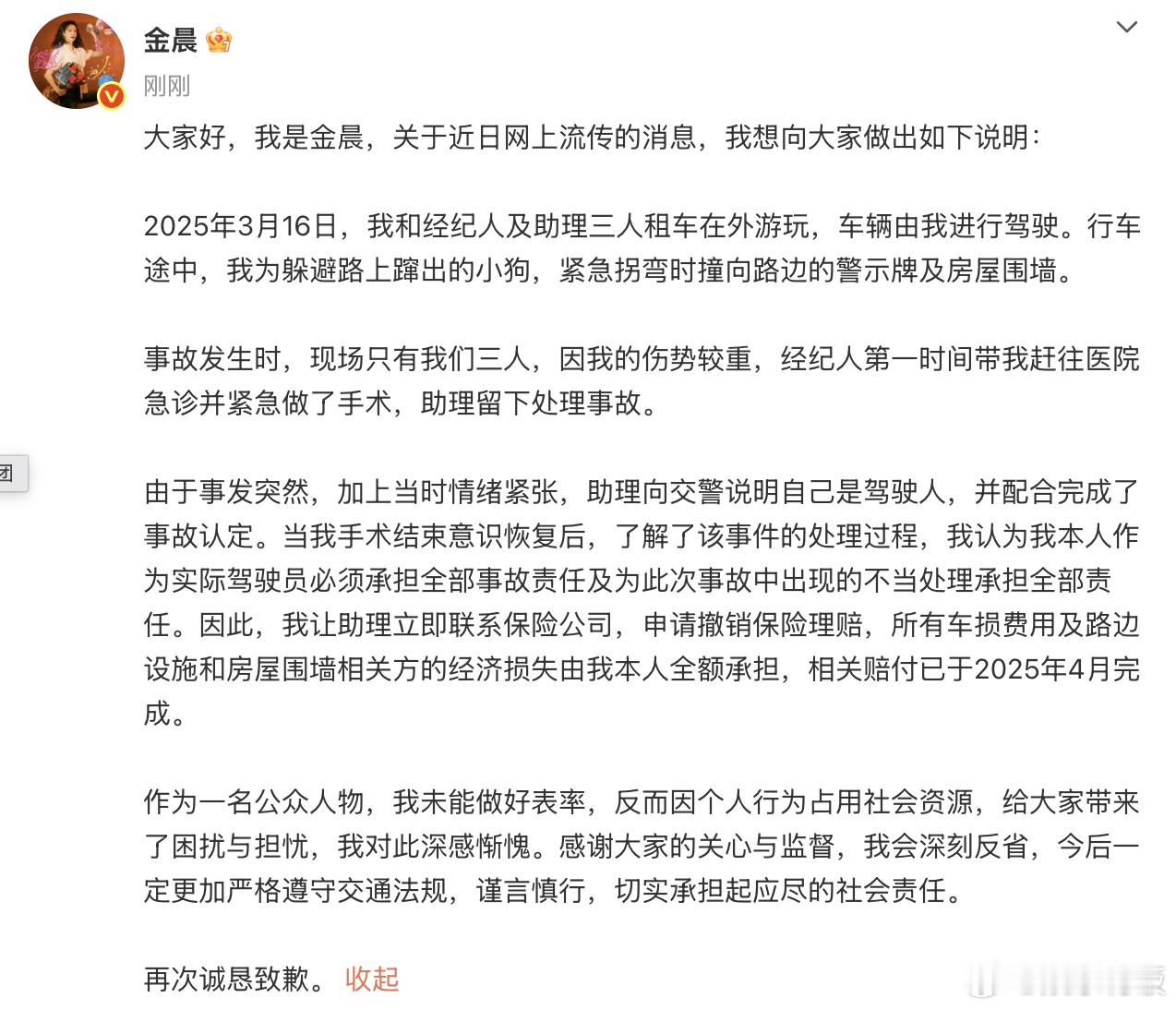 金晨发博道歉金晨称已全额承担交通事故费用 金晨发博就去年 3 月的交通事故及后续 “顶包” 风波发文致歉,表示自己作为实际驾驶员,已全额承担了车损及相关设施的赔偿费用。同时,她也为自己作为公众人物未能做好表率、占用社会资源致歉,表示会深刻反省,今后将更加严格遵守交通法规。