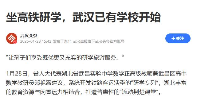 湖北省一位高中数学老师在省人大会上提出一个特别实用的点子:利用铁路淡季的空闲车厢,开“研学专列”,让湖北娃们能便宜又充实地出去玩学结合。   这事听着不复杂,其实想得很透。眼下学生的书读得是多了,可眼界开得却不够,课本里讲的山河和历史,远不如真站在现场看一眼来得直接,这时候,研学旅行就成了个新出路。   但说起来容易,真组织一趟研学,学校得费劲,家长也得掏腰,不少地方干脆不搞,怕麻烦怕出事,能出去的,基本也就那几类学校和家庭,讲白了就是“条件好的走得远,条件差的干看着”。   郑艳霞琢磨的是怎么把这事做大做实又让人负担得起,她盯上的,就是铁路那些淡季闲着的车厢,平时人少,空着也是空着,为啥不能让学生来坐?有现成的轨道、有固定的线路、有成熟的调度,这些资源不动用,实在可惜。   她的建议是,把铁路、教育、文旅几方联合起来,别各干各的,统一安排线路、统一协调资源,让火车不只是运输工具,而是变成流动的课堂,学生坐上去,不光是换了个地方旅游,而是真正在路上学东西。   说白了,就是让学习这事儿从教室走出来,从固定的时间地点里跳出来,火车上可以安排讲座,到了地方可以实地参观,坐着火车也能长见识,这种学习,比死记硬背有意思多了,也更容易让学生有印象。   这个想法不是拍脑袋拍出来的,湖北有的是文化资源,红色的、绿色的、科技的、历史的,哪一类都不缺,把这些资源串成线路,专列一开,不光是学生得益,当地文旅也能跟着走起来,算是一举两得。   但最关键的,还是“普惠”这两个字,过去研学贵,就贵在人多不好安排,吃住行样样都要钱,火车一来,能集中运人,成本一下就摊得开,一列车能坐多少人,安排一次下来,人均花费就低了不少。   而且火车这玩意,安全系数高,组织起来也容易,铁路部门本来就有经验,搞团体票、统一座位、专人引导都不在话下,学生坐火车出行,比坐大巴、住旅馆安全得多,老师和家长也放心。   当然,这事要真做,还得靠政策来推,不是说哪个学校想干就能干得了的,郑艳霞提的是“省级统筹”,意思是这事得上升到政府层面来协调,不是哪个学校自发组织能解决的。   这事也正赶上好时候,国家对研学越来越重视,相关标准和保障也在逐步建立,湖北本地也在推动文旅融合,这样的研学专列,正好能当个突破口,政策有了,资源有了,就差一个好思路把它们串起来。   说到底,教育不是只有课本和分数,让学生有机会走出去,看一看、听一听、接触点实打实的东西,比在教室里多背几道题管用得多,尤其是对那些平时出不去的孩子来说,这样的机会可能就那么一次。   其实,这样的专列一旦开起来,不光是学生受益,老师也能从中找到新的教学方式,教学不光是讲课本,更多的是引导学生怎么理解世界,研学就像是给教学加了一层“现实滤镜”,让知识变得有温度。   有些人可能觉得这事不现实,觉得铁路不是给学生用的,但反过来想,学生是国家未来,投入到他们身上的资源,不是浪费,是投资,火车空着也是空着,不如让它们动起来,带着孩子们去看看世界。   这事要成,得有愿意干事的人,郑艳霞的建议就是一个起点,她不是搞宣传,也不是为学校争光,就是一个把平时教育中的难题琢磨透了,提出来让更多人听见的老师,她看到了问题,也想出了办法。   而能不能成,就看有没有部门愿意接这个球,只要铁路、文旅、教育三方坐下来谈一谈,把流程打通,把保障做好,这事就有可能从一个建议变成现实,说到底,关键还是看有没有人愿意动手去干。   至于学生,他们是最直接的受益者,坐着火车去研学,不再是只有少数人才能享受的待遇,也不再是一次性体验,而是可以常态化的学习方式,这种学习,不光能长知识,更能开眼界、提兴趣。   如果这事成了,湖北很可能就会起个头,后面其他省市也会跟上,教育改革不总是从上到下走,有时候,就是从一个老师的一句话开始,慢慢地就能变成一股风,吹进更多地方的校园里去。   教育的意义,不在于把每个孩子都培养成考试机器,而是让他们有能力理解世界、参与社会、改变未来,而真正好的教育方式,不是让孩子困在教室里,而是给他们一双能走远的脚和一颗能看清方向的心。   如果说火车是工具,那研学专列就是一把钥匙,帮孩子们打开外面的世界,走出去,见识多了,心胸自然也就开阔了,这不止是一次旅行,而是一次成长。   现在的问题不是“要不要做”,而是“怎么做得好”,只要有人带头干,政策跟得上,资源用得巧,这事就能落地,真到了那一天,不只是湖北的孩子,可能全国的学生都能坐上这趟“学在路上”的专列。   教育有时候太讲究统一标准,反而忘了每个孩子都有不同的成长路径,研学专列不是万能药,但它至少能让我们往多元化的教育方式上多走一步,而这一步,值,你们觉得呢?