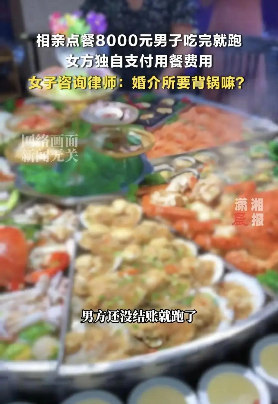 太解气了,做了多少男人想做不好意思做的事! 男女相亲,第一次见面去饭店吃饭,女的就不管能不能吃得下,一口气点了8000元的餐费。 王先生气定神闲的陪苏女士吃完,然后给苏女士说自己要去上厕所,苏女士没想到王先生自己走了,餐费也不付了。 苏女士多次打王先生的电话,他也不接,苏女士只好自己付了8000元的餐费。 苏女士事后想想花8000元吃一顿饭太不划算了,于是找到婚介所想让婚介所出一半,结果被拒绝了。 网友们却都夸王先生干的漂亮,看苏女士这架势就没啥诚意,一顿8000元,明显的想让男方吃“哑巴亏”。 可她万万没想到王先生会找借口开溜。