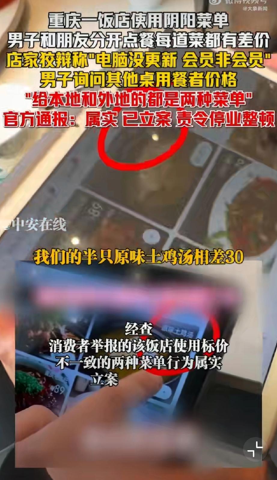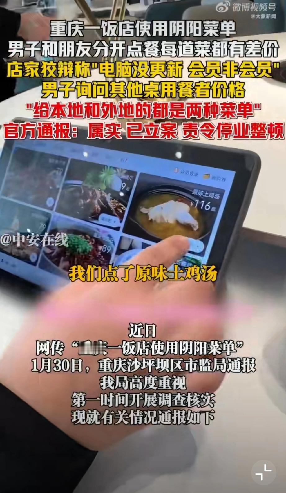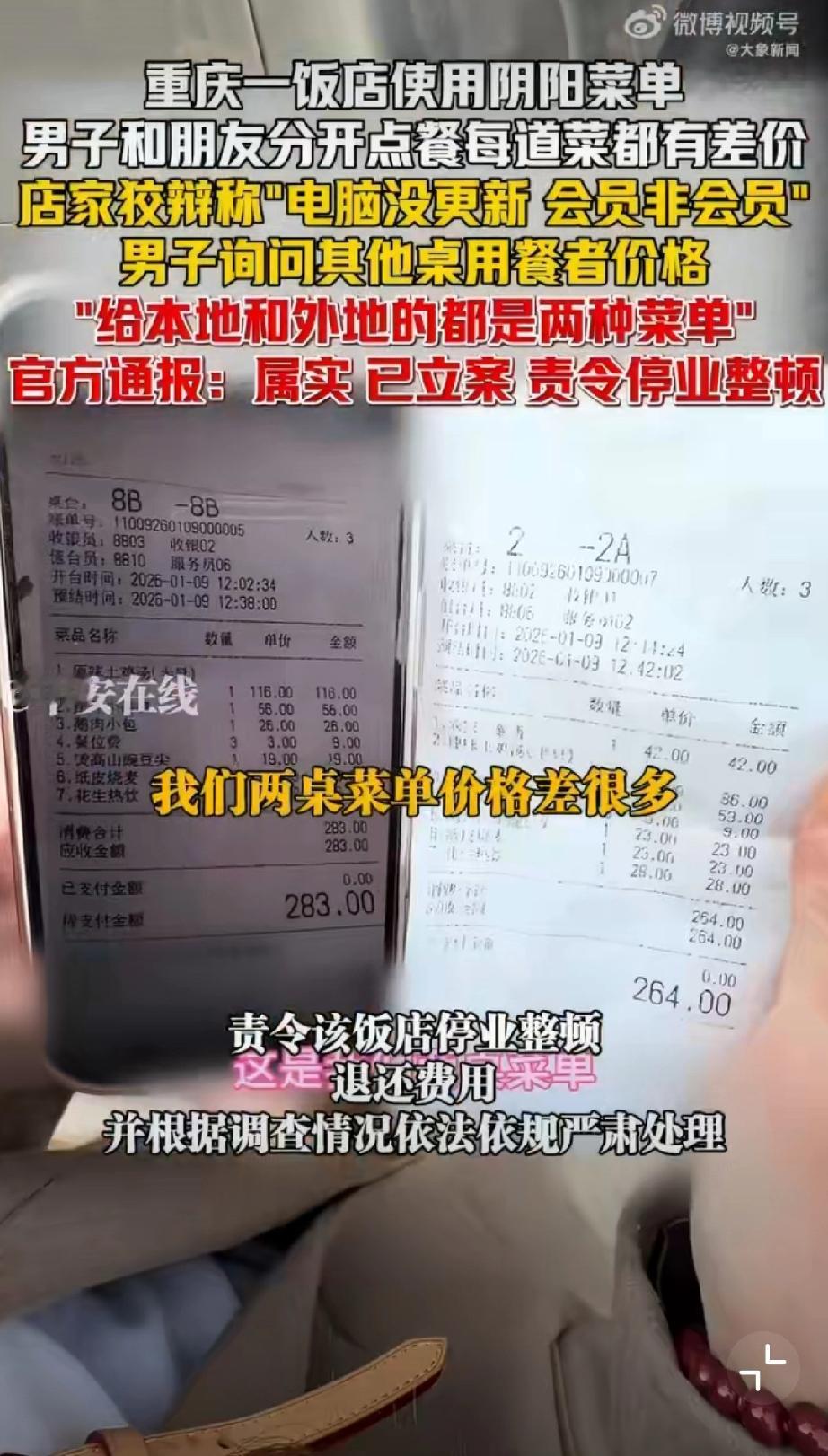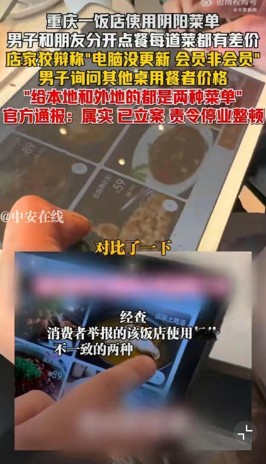 重庆使用阴阳菜单饭店被停业整顿。 1月29日晚,有网友在社交平台曝光重庆某饭店存在“阴阳菜单”宰客行为。该饭店涉嫌根据顾客口音区分本地人与外地游客,提供两种标价不同的菜单,同类菜品差价达数十元。面对质疑,涉事饭店曾以“电脑未更新”“会员价与非会员价不同”等理由辩解。1月30日,重庆市沙坪坝区市场监督管理局发布通报,经查该饭店违规行为属实,目前已责令其停业整顿并退还相关费用。该案调查已终结,后续将依法依规严肃处理。监管部门同时强调,对损害消费者权益的行为始终零容忍,将继续加强市场监管,坚决查处扰乱市场秩序的违法行为,切实维护消费者合法权益。重庆文旅宰客 重庆餐饮业 重庆身边事