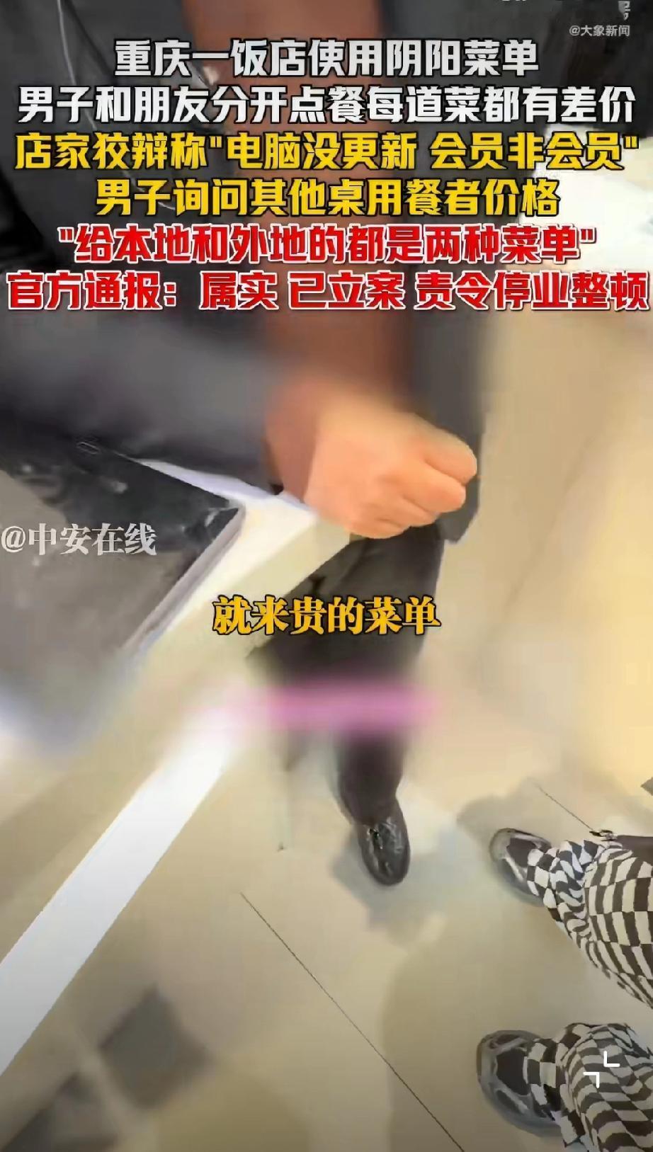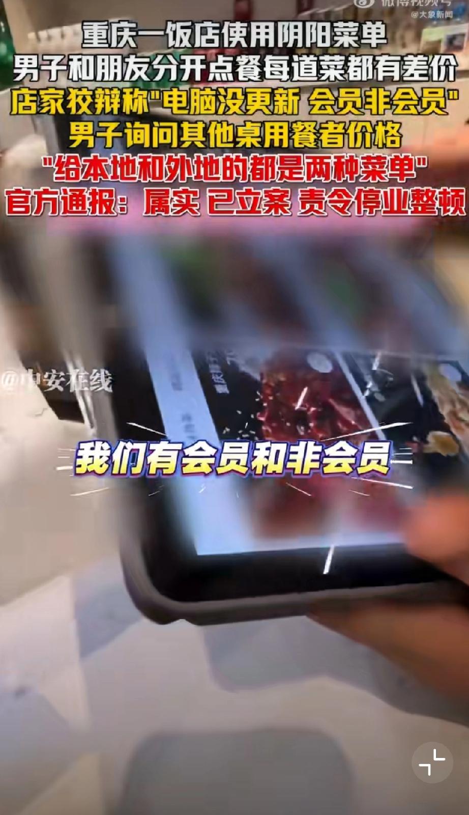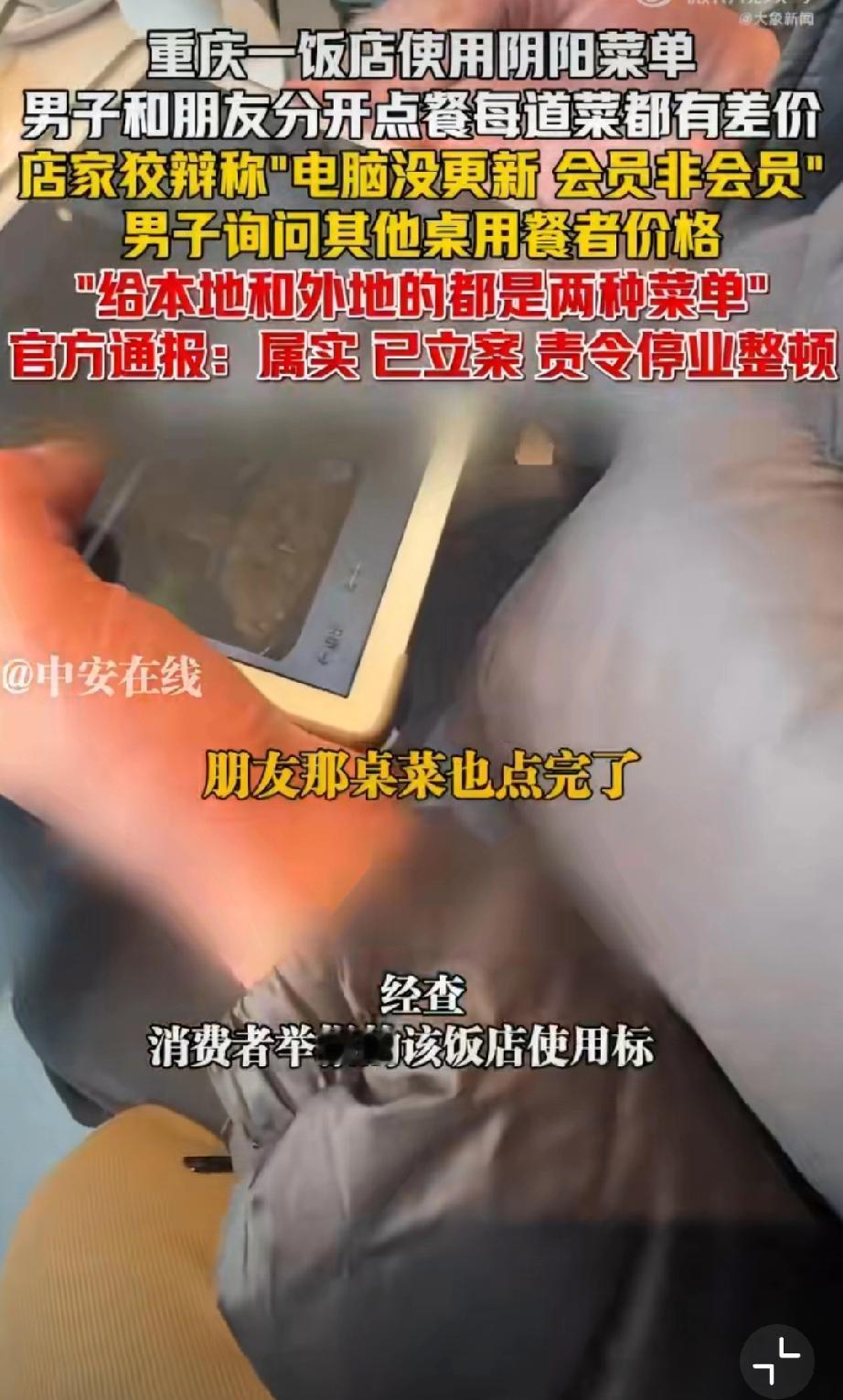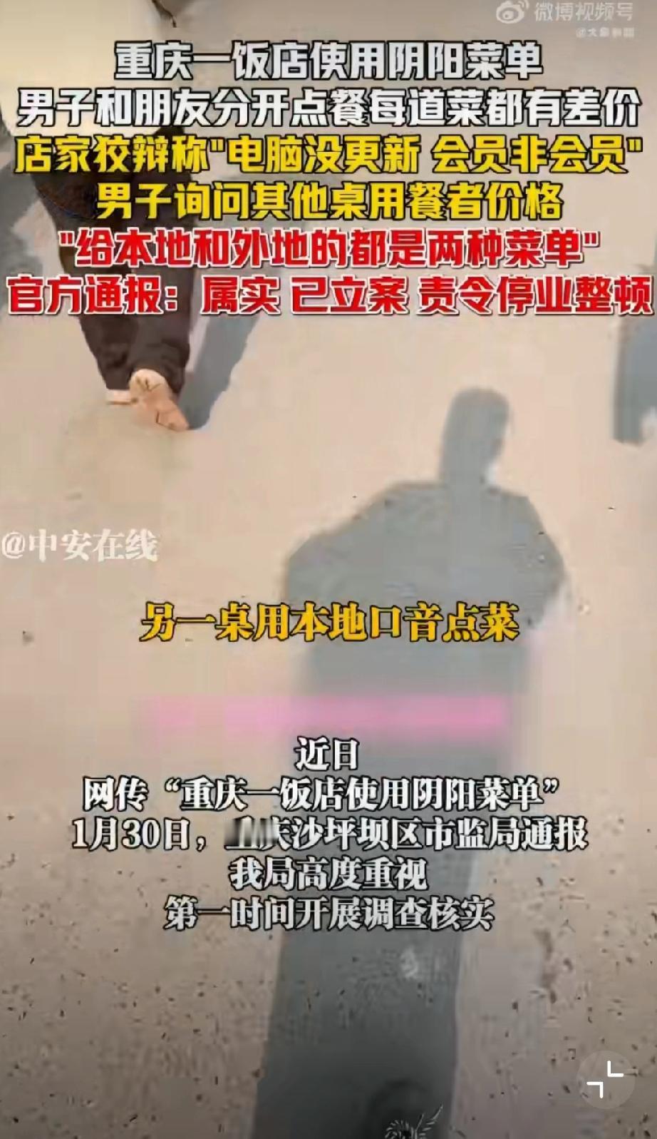 重庆使用阴阳菜单饭店被停业整顿。 1月29日晚,有网友在社交平台曝光重庆某饭店存在“阴阳菜单”宰客行为。该饭店涉嫌根据顾客口音区分本地人与外地游客,提供两种标价不同的菜单,同类菜品差价达数十元。面对质疑,涉事饭店曾以“电脑未更新”“会员价与非会员价不同”等理由辩解。1月30日,重庆市沙坪坝区市场监督管理局发布通报,经查该饭店违规行为属实,目前已责令其停业整顿并退还相关费用。该案调查已终结,后续将依法依规严肃处理。监管部门同时强调,对损害消费者权益的行为始终零容忍,将继续加强市场监管,坚决查处扰乱市场秩序的违法行为,切实维护消费者合法权益。重庆文旅宰客 重庆餐饮业 重庆身边事