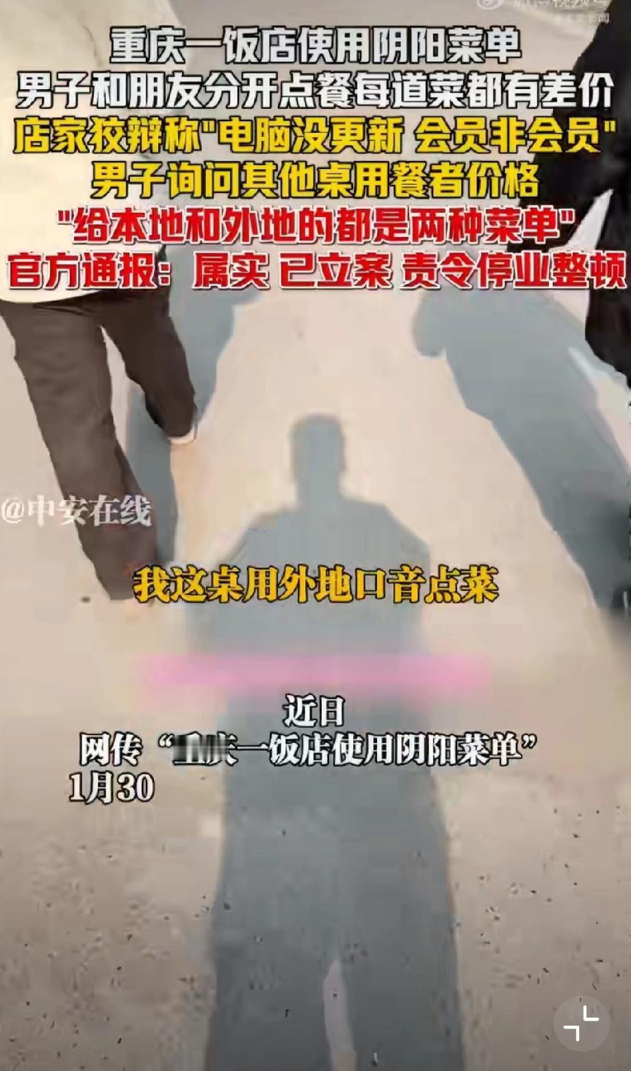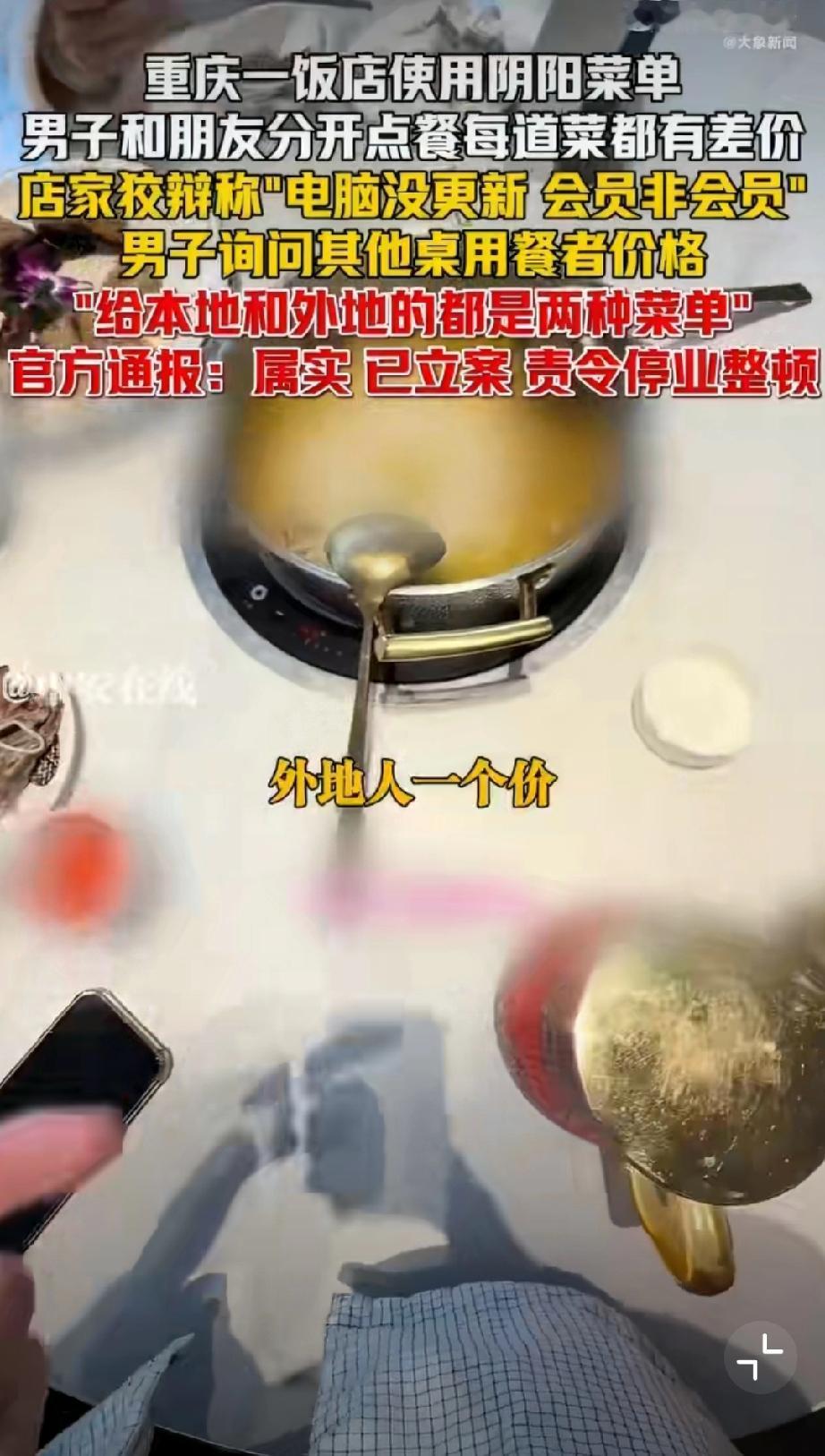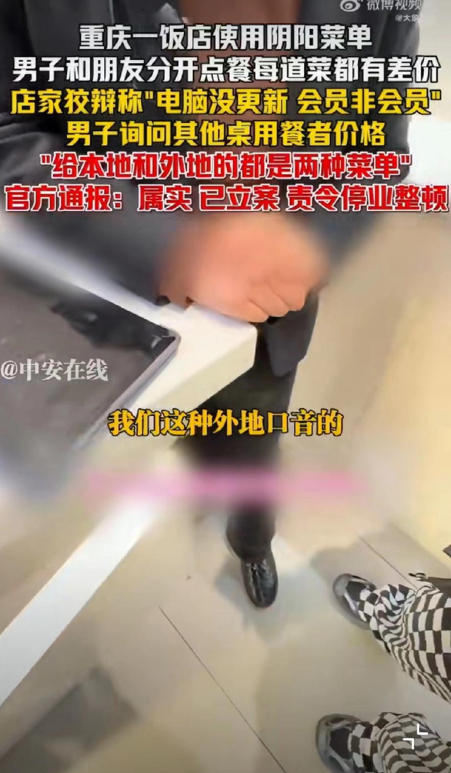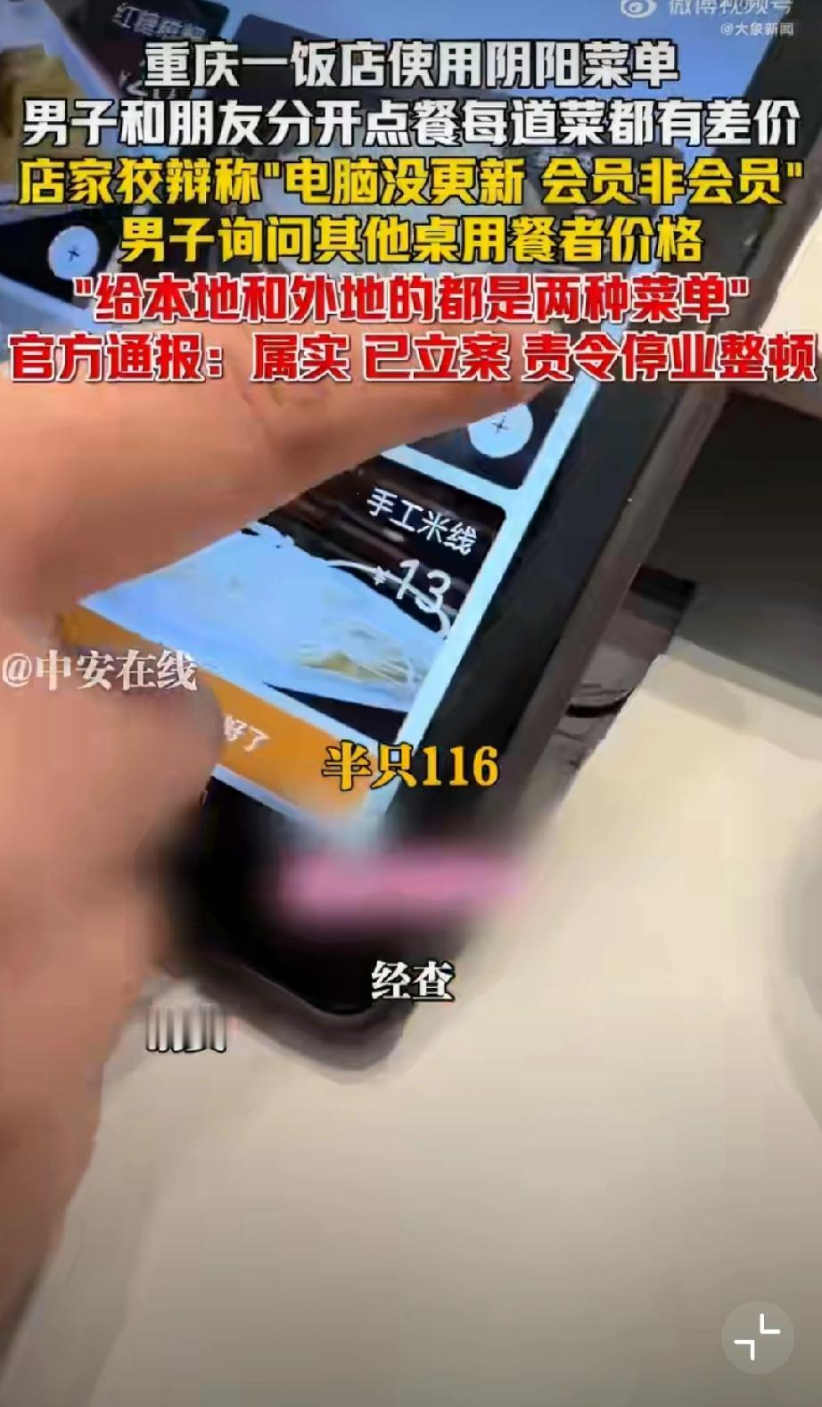 重庆使用阴阳菜单饭店被停业整顿。 1月29日晚,有网友在社交平台曝光重庆某饭店存在“阴阳菜单”宰客行为。该饭店涉嫌根据顾客口音区分本地人与外地游客,提供两种标价不同的菜单,同类菜品差价达数十元。面对质疑,涉事饭店曾以“电脑未更新”“会员价与非会员价不同”等理由辩解。1月30日,重庆市沙坪坝区市场监督管理局发布通报,经查该饭店违规行为属实,目前已责令其停业整顿并退还相关费用。该案调查已终结,后续将依法依规严肃处理。监管部门同时强调,对损害消费者权益的行为始终零容忍,将继续加强市场监管,坚决查处扰乱市场秩序的违法行为,切实维护消费者合法权益。重庆文旅宰客 重庆餐饮业 重庆身边事