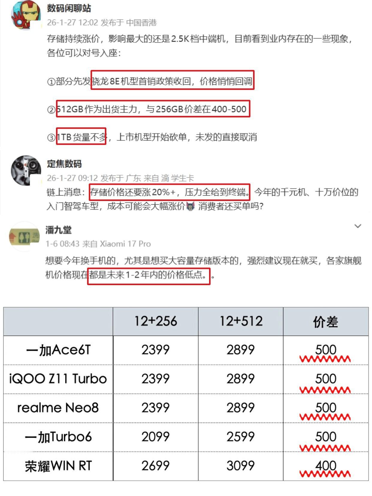 现在买还是等等看价格 看到消息说储存要涨价了,其中2.5k档的手机影响最大。本来想等等618或者双十一,现在有点慌。 512G和256G差价要从400涨到500多,1T直接起飞。 我现在的手机还能再撑半年,但想想到时候可能要多花好几百 而且这种趋势下去的话,苹果可能也会跟着涨,那入门款可能真要破万了,感觉现在的消费者越来越难了......