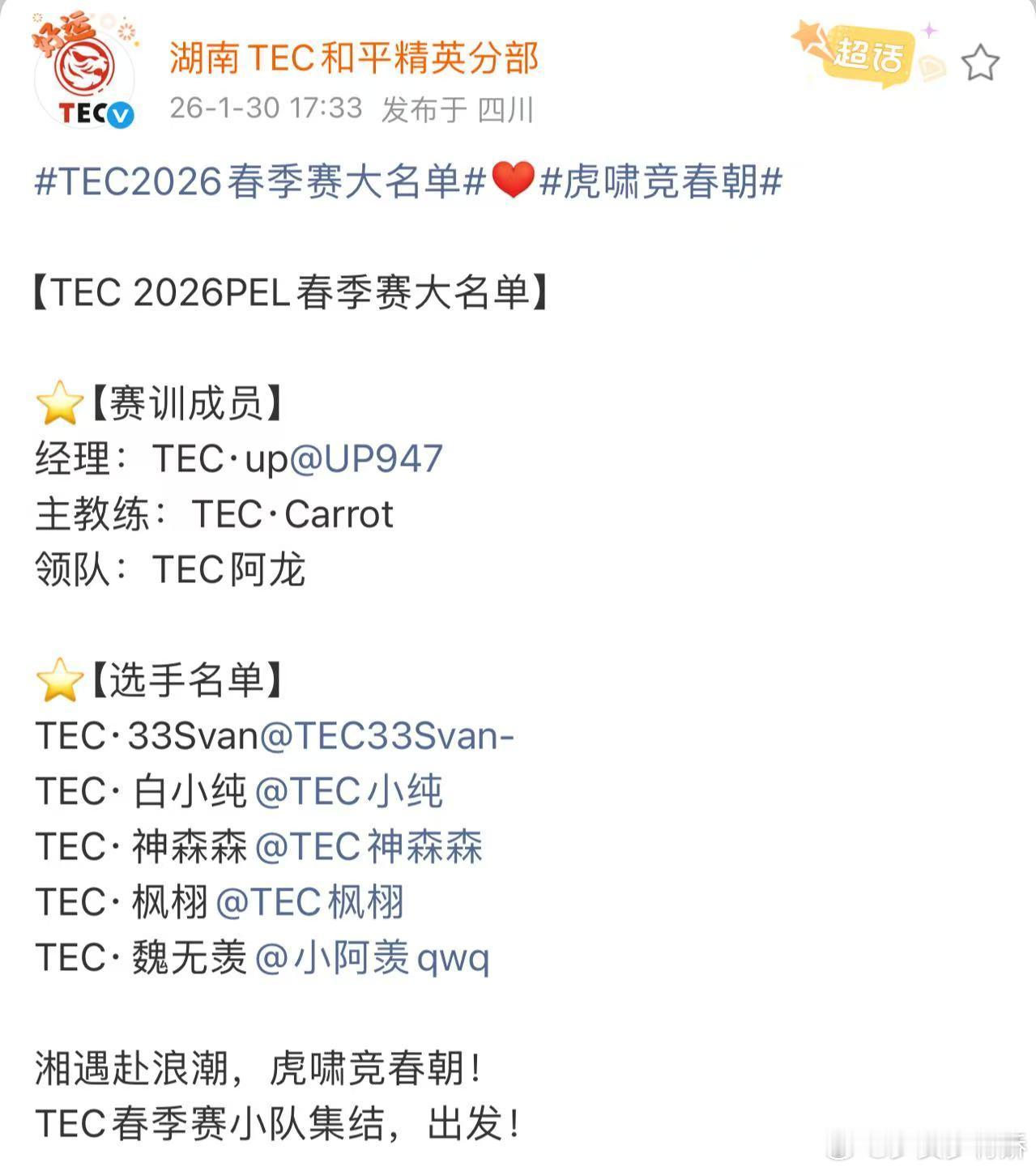 2026PEL春季赛大名单TEC2026春季赛大名单 TEC春季赛全新阵容官宣!33Svan带队,白小纯、神森森等选手携手并肩,新老搭档搭配新赛训团队,战力拉满,春日赛场静待他们乘风破浪!