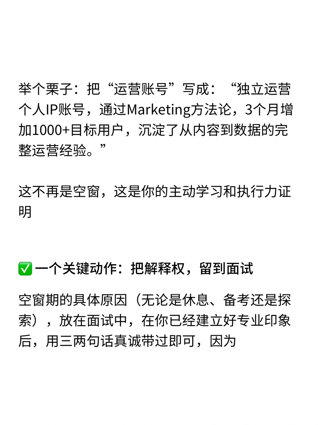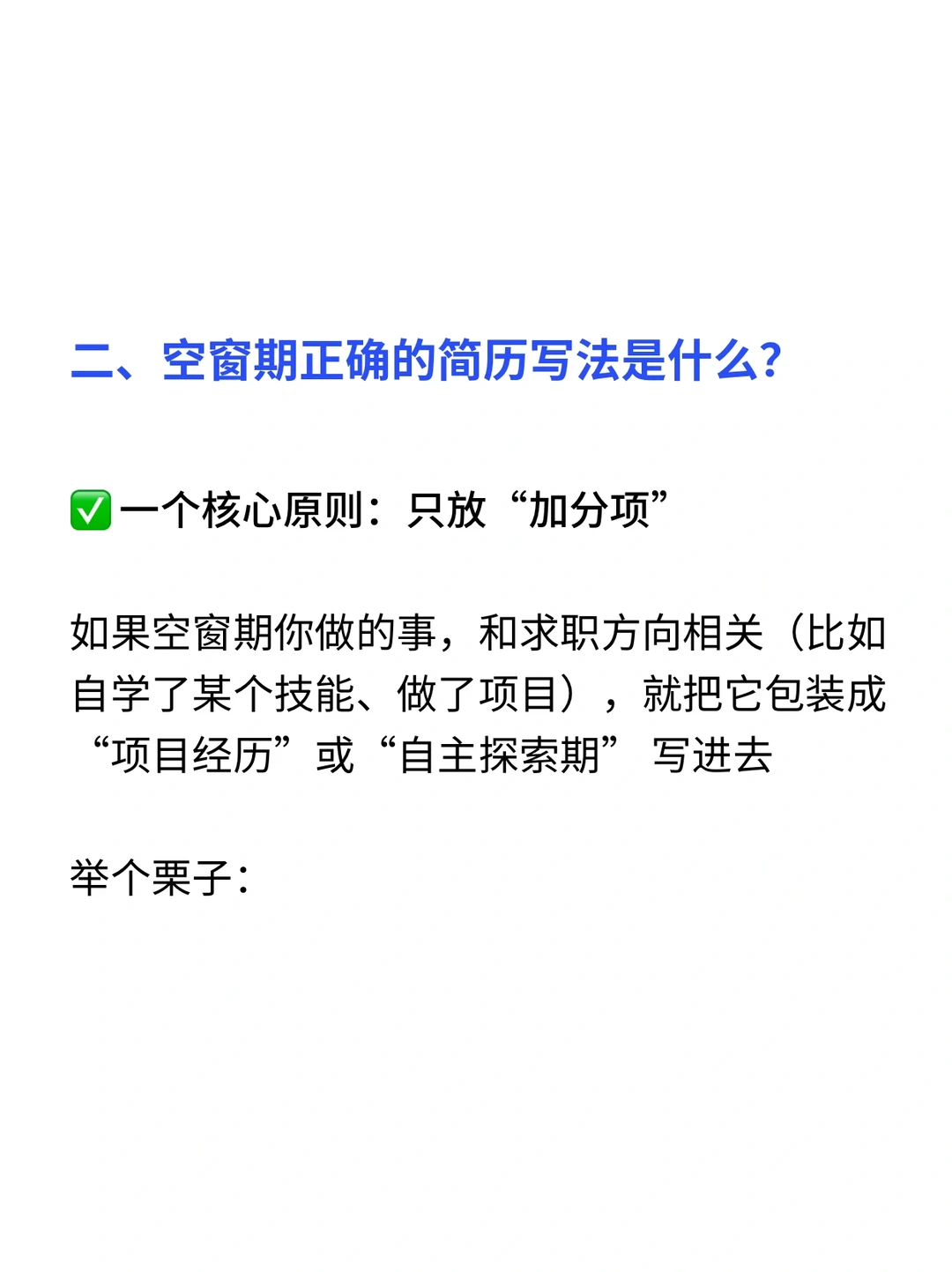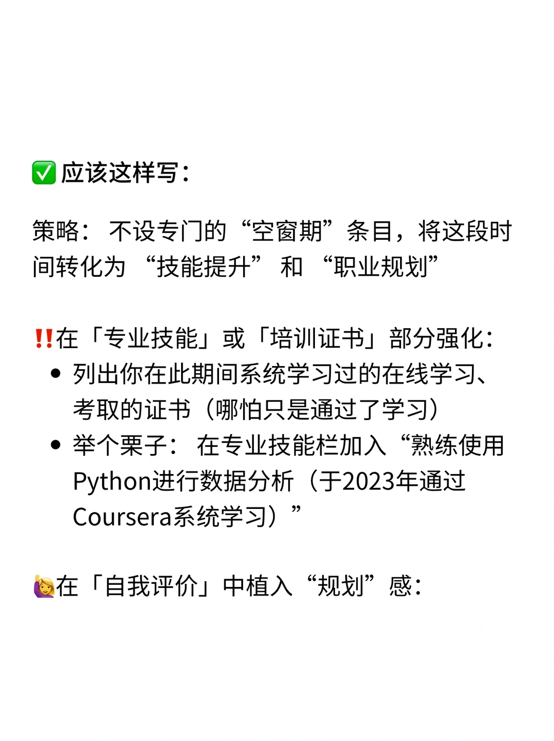 如果空窗期你做的事,和求职方向相关(比如自学了某个技能、做了项目),就把它包装成“项目经历”或“自主探索期” 写进去