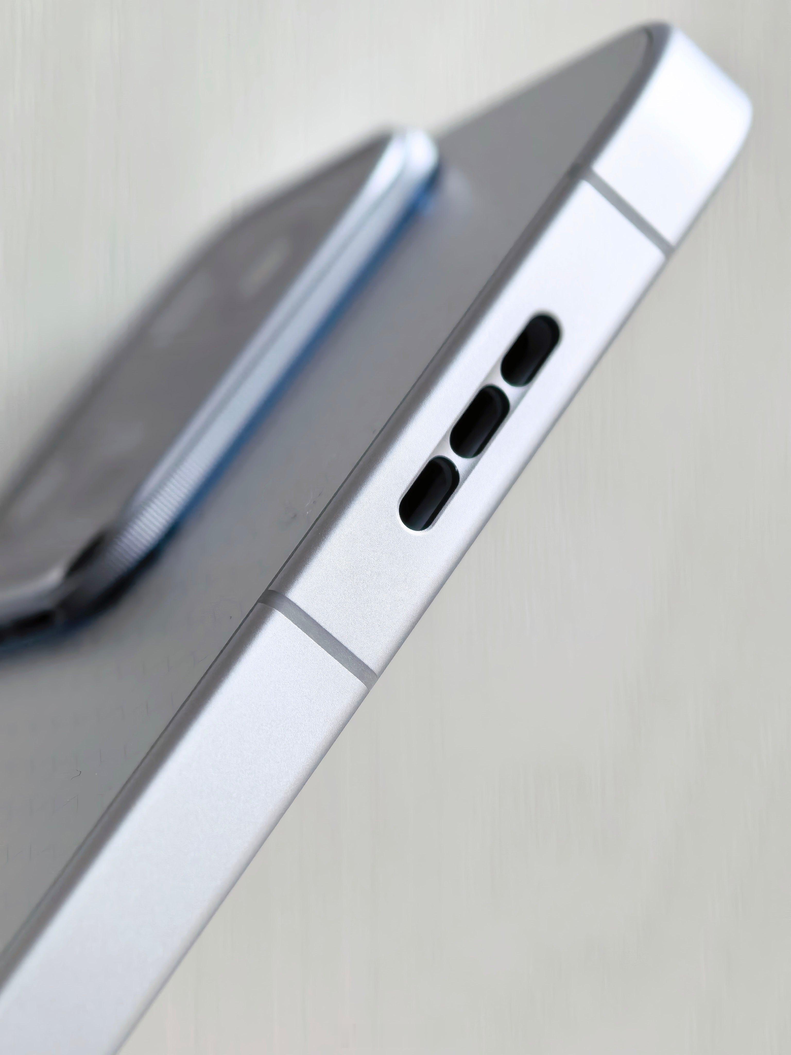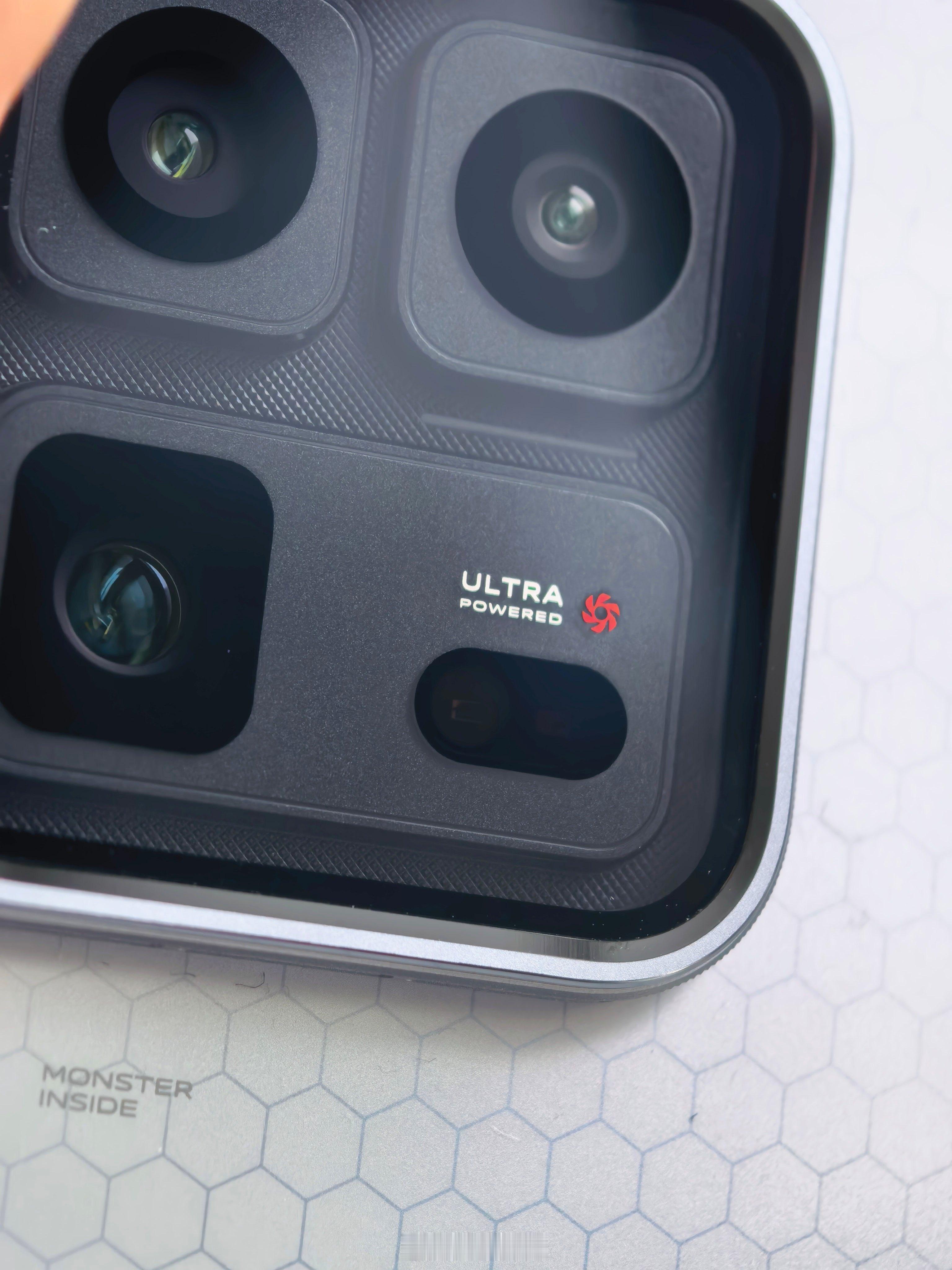 机身后盖下暗藏一层六边形蜂巢纹理,银色的机身呈寒光蓝色,这是由15 层精密工艺实现能量矩阵「流光视效」,矩阵纹理着色位置可随手机转动呈现流光变化,太有未来感了!还有Monster Halo 呼吸灯,以及U L T R A 专属标识,这手机一眼看去就太硬核!