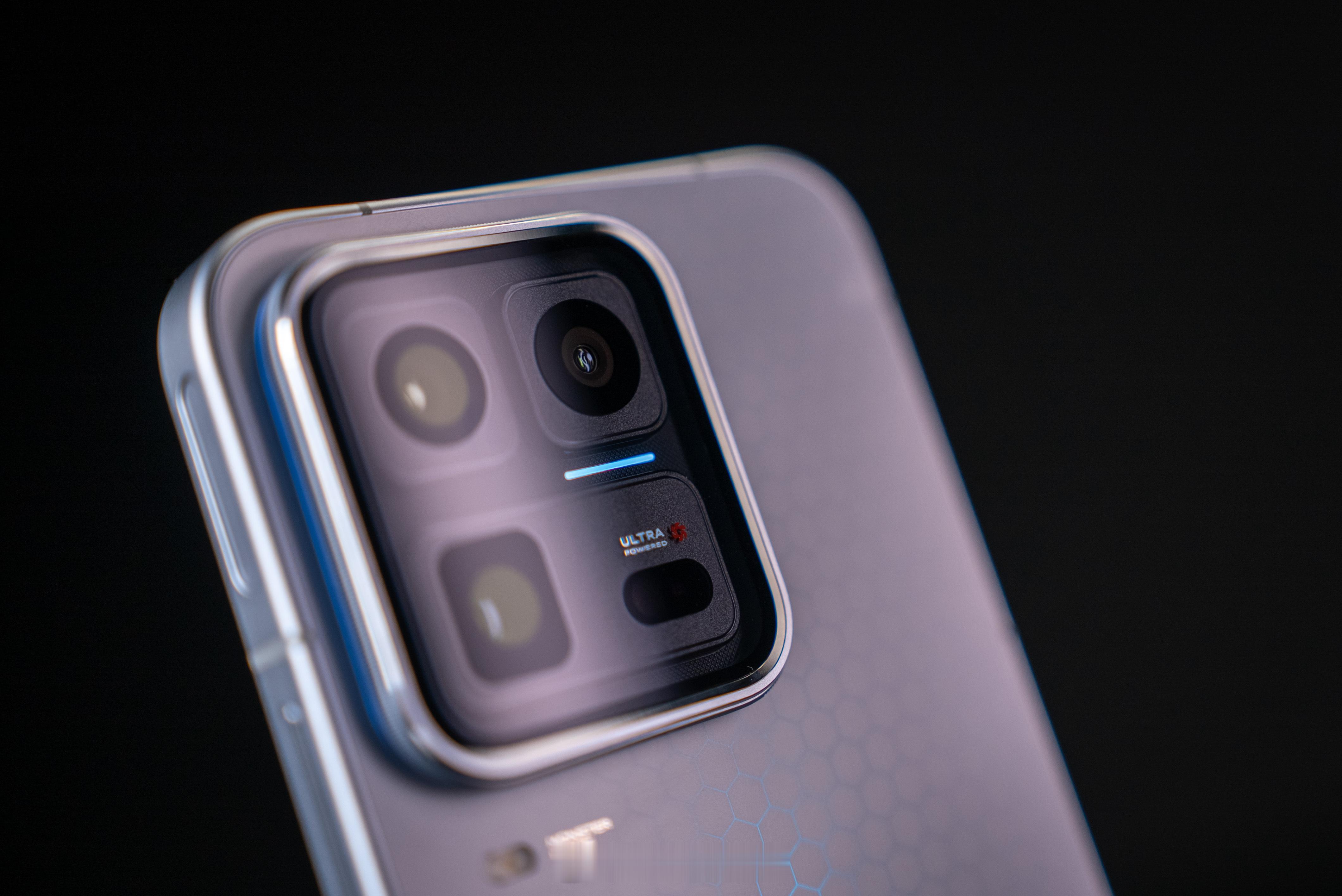 整机是磨砂手感,搭配大 R 角,握着完全不硌手,打游戏实测很 OK。背部 Deco 是透明可视化设计,带 Ultra 专属标识,还有 Monster Halo 呼吸灯,情绪价值给得足足的。