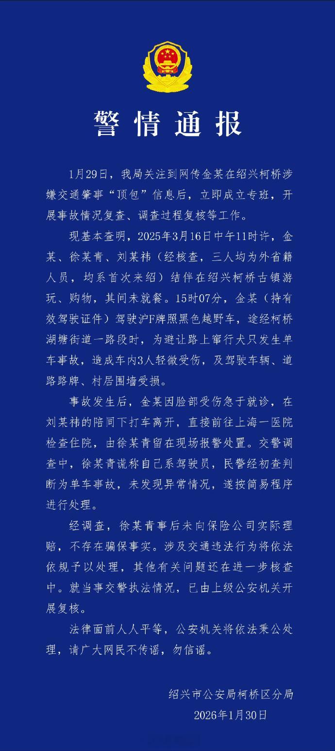 警方通报金晨事件金晨不存在骗保事实 30日,通报网传金晨涉嫌交通肇事“顶包”,称