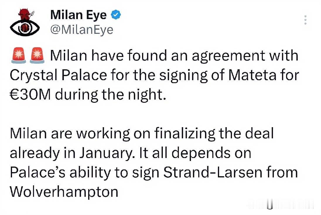 马特塔!米兰与水晶宫俱乐部达成一致,没错这次不是与马特塔本人达成一致,而是与水晶宫俱乐部达成一致,米兰对于马特塔的3000万欧元报价被水晶宫俱乐部所接受,现在水晶宫俱乐部在等待拉尔森加盟,拉尔森加盟水晶宫俱乐部,马特塔将加盟米兰。 直到现在为止我还是有点不相信,水晶宫俱乐部接受米兰的三千万欧元报价而不是诺丁汉森林俱乐部的三千五百万可以理解,毕竟诺丁汉森林俱乐部是对手,米兰与水晶宫俱乐部暂时没啥利息关系,卖米兰对于水晶宫俱乐部而言没啥损失。 但米兰现在买马特塔首先人员问题,我们可是单线作战,现在队内算上躺床上的希门尼斯米兰有五位前锋,哪个能接受替补?世界杯年无论是菲尔克鲁格还是莱奥都期待可以保持状态,不可能替补,我们租借了菲尔克鲁格又弄来马特塔,难道莱奥要出售?或者说恩昆库真的要加盟费内巴切俱乐部了?或者还有一种可能性,马特塔是夏季窗口加盟,米兰冬季窗口购买,但夏季窗口加盟,这样貌似就说的通了。