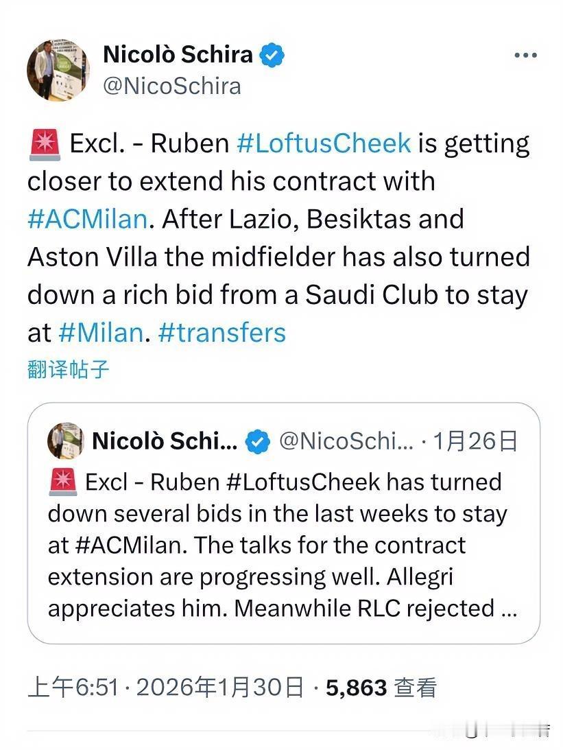 鲁本·洛夫图斯·奇克拒绝了多支俱乐部邀请。鲁本·洛夫图斯·奇克更加接近与米兰续约。继拉齐奥、贝西克塔斯和阿斯顿维拉之后,这位中场球员还拒绝了一家沙特俱乐部的高额报价,选择留在米兰。 鲁本·洛夫图斯·奇克不转会去阿斯顿维拉俱乐部主要原因是担忧阿斯顿维拉的主力位置,阿斯顿维拉俱乐部之所以着急购买奇克是因为他们主力中场十字韧带撕裂了,奇克是救火队员,等人家中场伤愈复出了,奇克很可能就要坐在替补席,这并不是鲁本·洛夫图斯·奇克所期望的。 鲁本·洛夫图斯·奇克之前替代福法纳打右边后腰表现十分出色,阿莱格里对奇克的表现非常满意,有消息说福法纳很可能离开米兰,是不是能理解为鲁本·洛夫图斯·奇克留下是替代福法纳打右边后腰,这样福法纳的转会费可以直接收入口袋,米兰的财务报表又盈利了。