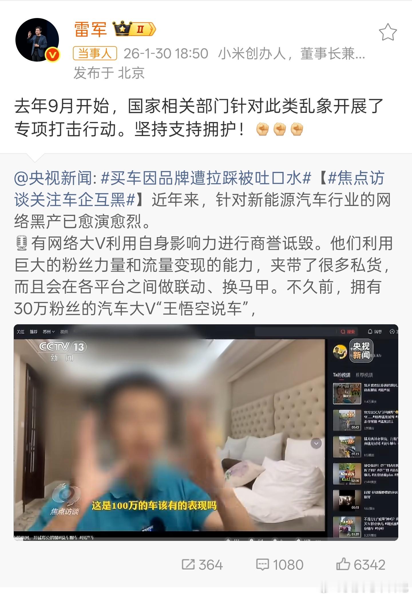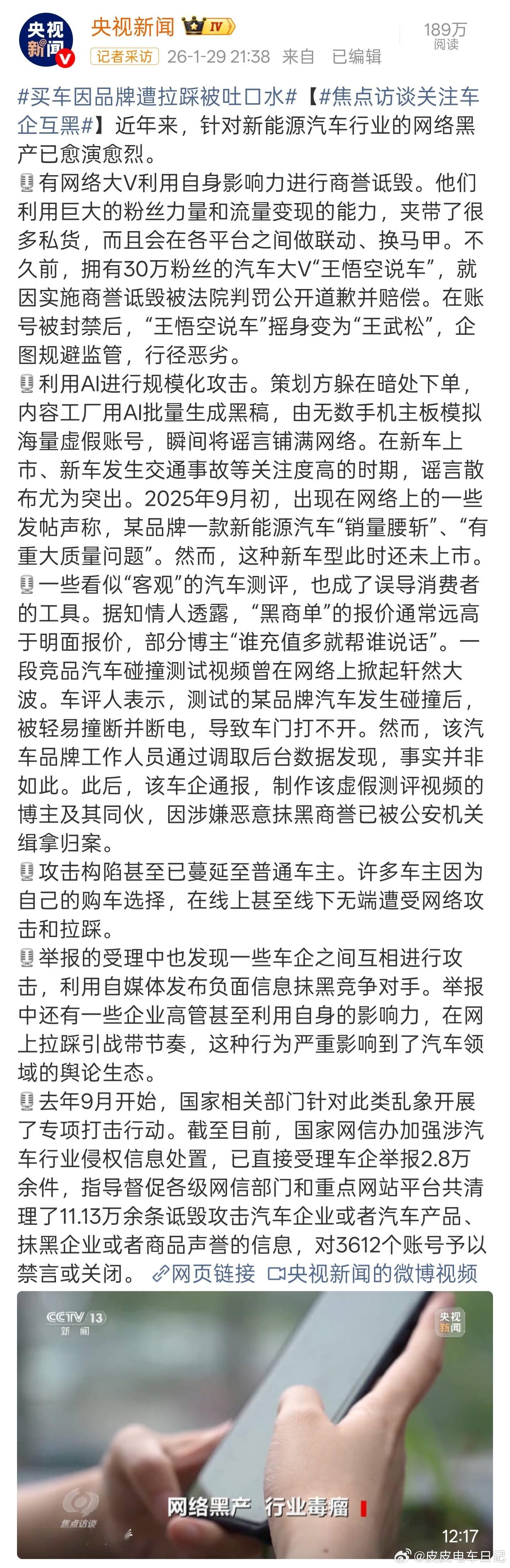 雷总喊话支持打击车企互黑,这绝对是好事一桩,我举双手赞成,毕竟当前车圈的网络黑产,已经猖狂到让人看不懂的地步,早该好好治治了。就例如某些换皮的汽车大V,比如“王悟空说车”,被法院判了道歉赔偿,账号封了就立马换成“王武松”继续作恶,靠着粉丝量夹带私货、诋毁品牌,把流量变现的路走成了歪门邪道。更可怕的是AI批量黑稿的流水线,策划方躲在背后下单,内容工厂用AI攒出一堆谣言,再靠虚假账号瞬间铺满全网,连没上市的新车都能被造谣“销量腰斩”“质量翻车”,简直毫无底线。还有些看似客观的测评,实则是“谁充值多帮谁说话”的生意。前段时间有博主发竞品碰撞测试视频,恶意编造“撞断断电、车门打不开”的谎言,结果被车企后台数据打脸,最后被警方缉拿,这就是恰烂钱的下场。最无辜的还是普通车主,就因为选了某款车,线下被划车、线上遭网暴,连正常用车都要受牵连。更让人失望的是,这种乱象还蔓延到了车企高层,有些高管不好好搞研发,反而亲自下场拉踩引战,把行业竞争变成了“嘴仗大赛”,严重搅乱了舆论生态。好在这次有关部门终于出手了,从去年9月开始的专项打击,清理了11万多条恶意信息,关停了3600多个违规账号,算是给行业敲了警钟。但要彻底根治,光靠监管还不够,车企得守底线不互黑,媒体得讲良心不恰烂钱,消费者也得擦亮眼睛不信谣。中国新能源汽车好不容易走到今天,可别让这些内耗,毁了整个行业的未来。