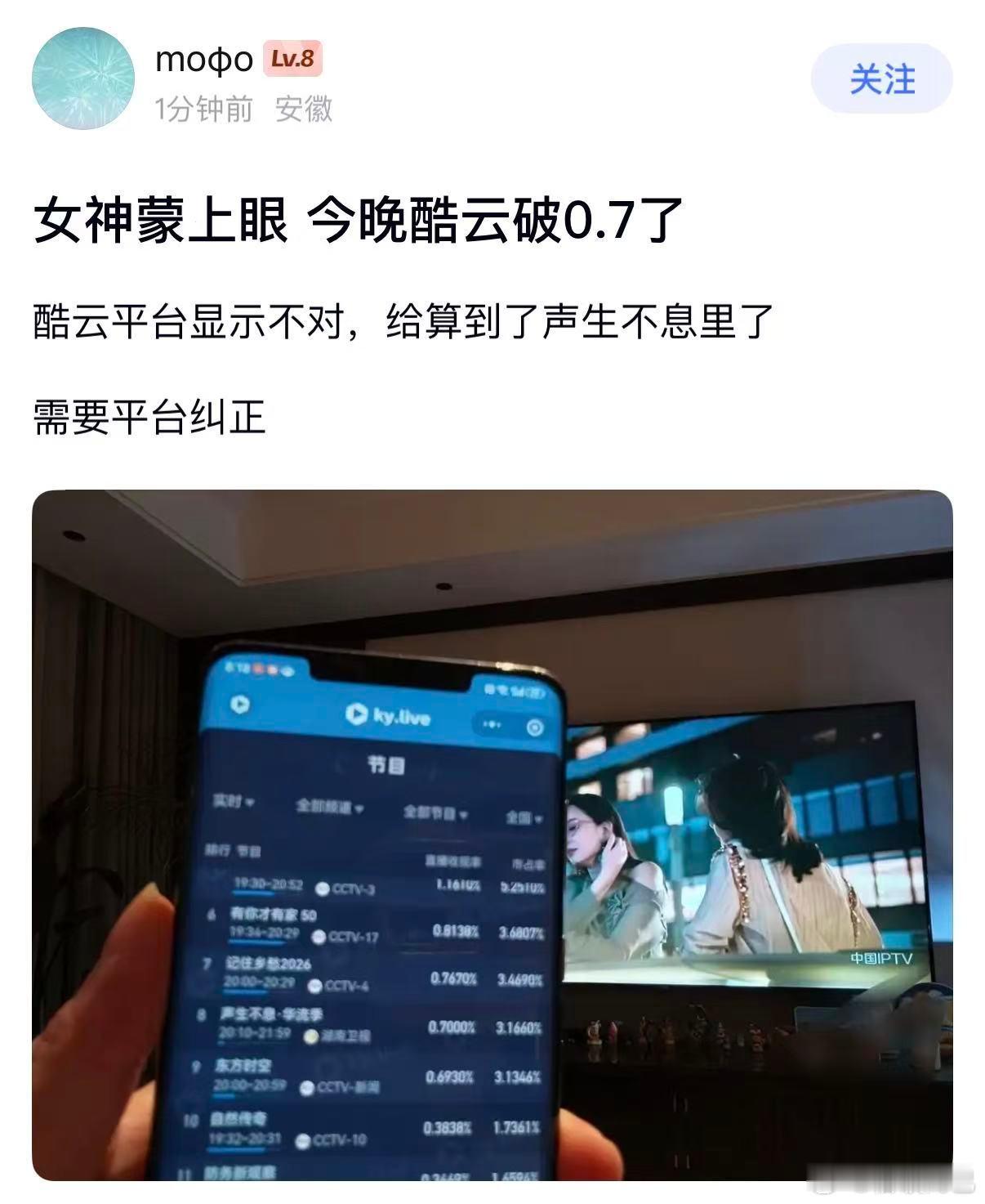 酷云搞啥啊…辛芷蕾今天女神蒙上眼收视创新高直破0.7,结果数据算到后面综艺里去了…酷云居然才显示0.5几,无语