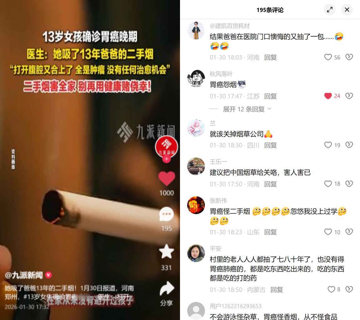 13岁胃癌晚期,病因成罗生门 郑州一名13岁女孩确诊胃癌晚期,腹腔布满肿瘤无法手术。医生点明长期吸父亲二手烟是诱因,这话一出,全网引起了巨大争议。 有人骂医生甩锅,有人揪着食品安全不放,还拿老人抽一辈子烟没事当论据。翻下权威医学报告就懂:二手烟里的尼古丁会直接破坏胃黏膜屏障,还能和幽门螺杆菌协同致癌,儿童长期暴露的风险更是数倍于成年人。 大家不愿认这个账,本质是怕打破身边人无害的幻觉。比起指责看不见的食品添加剂,承认家人的疏忽太沉重,找个遥远的替罪羊,总比直面自己或熟人的过错容易得多。 我们总爱盯着远方的风险,却常常忽略,最该警惕的可能就在眼皮子底下。