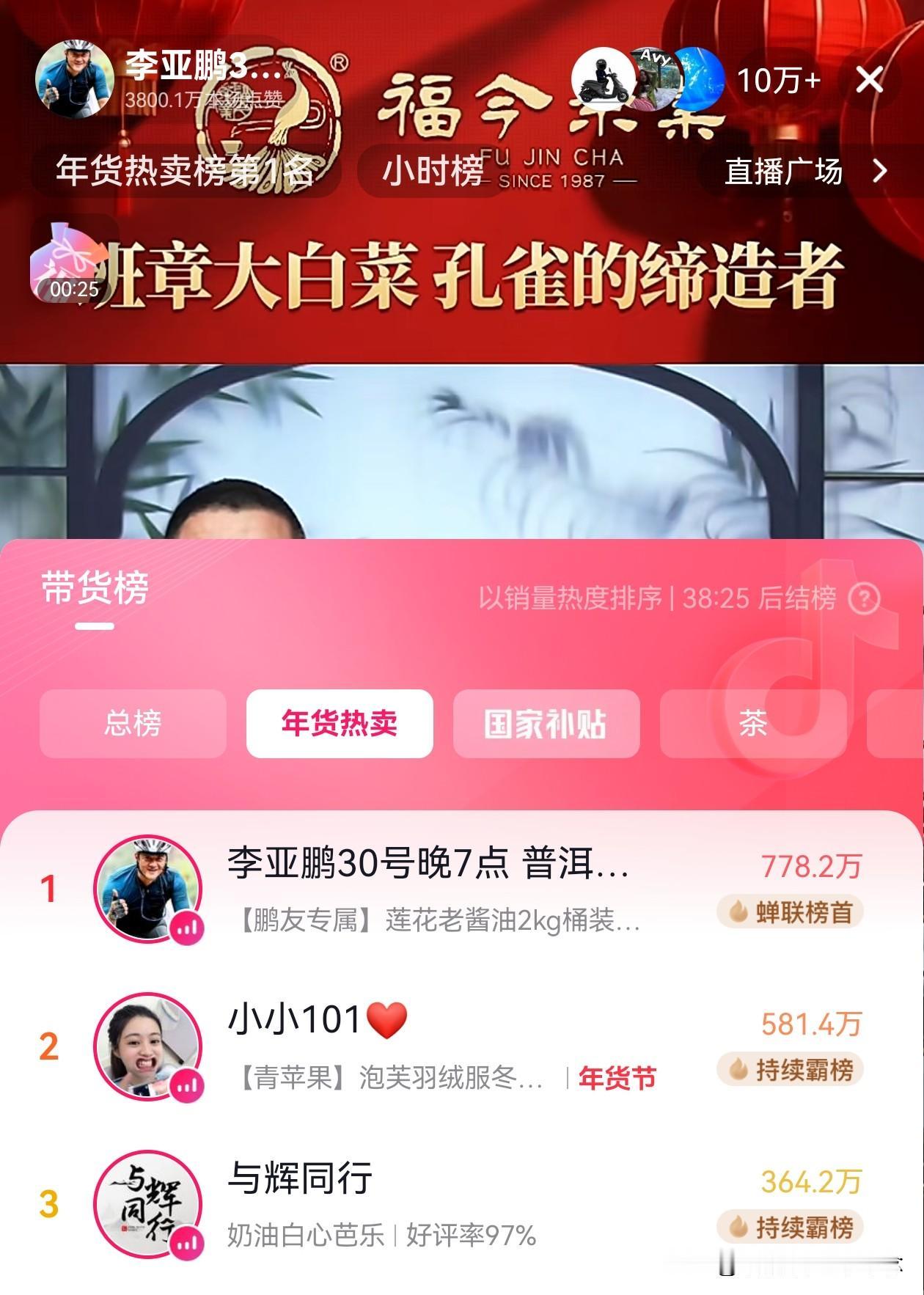 真是不服不行啊,李亚鹏今天的直播又是10万+,一直稳居年货热卖榜第一,连合作的茶商“福今茶叶”总经理都一直处于懵的状态。 别的直播间主播和商家开价格像演剧本,一个假装砍价,一个假装亏本,一个一直喊再降点,一个一直说不要啊! 再看李亚鹏的直播间,价格是真砍,商家也是真懵啊,何经理瞪大的眼睛,茫然的表情真不是演的,就连泡出的茶都忍不住自己要喝一口,还说“这种茶喝一泡少一泡了。”我这个不喝茶的人看着他们喝都有点想来一口了。 不管是哪种茶,上架就秒没,李亚鹏和茶商都很真诚,没有声嘶力竭的叫卖,没有虚头巴脑的套路,只是实实在在地介绍茶的产地、工艺,坦坦荡荡地给出让利的价格。 今天的茶叶你抢到了吗?