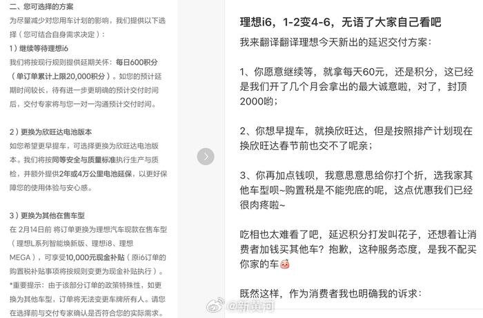 为了平息众怒,理想汽车在公告中给出了三个“可选方案”:一是继续等待并领取积分补偿;二是更换为欣旺达电池版本以期更早提车;三是更换为其他在售车型(如L系列、i8等)并享受1万元现金补贴。