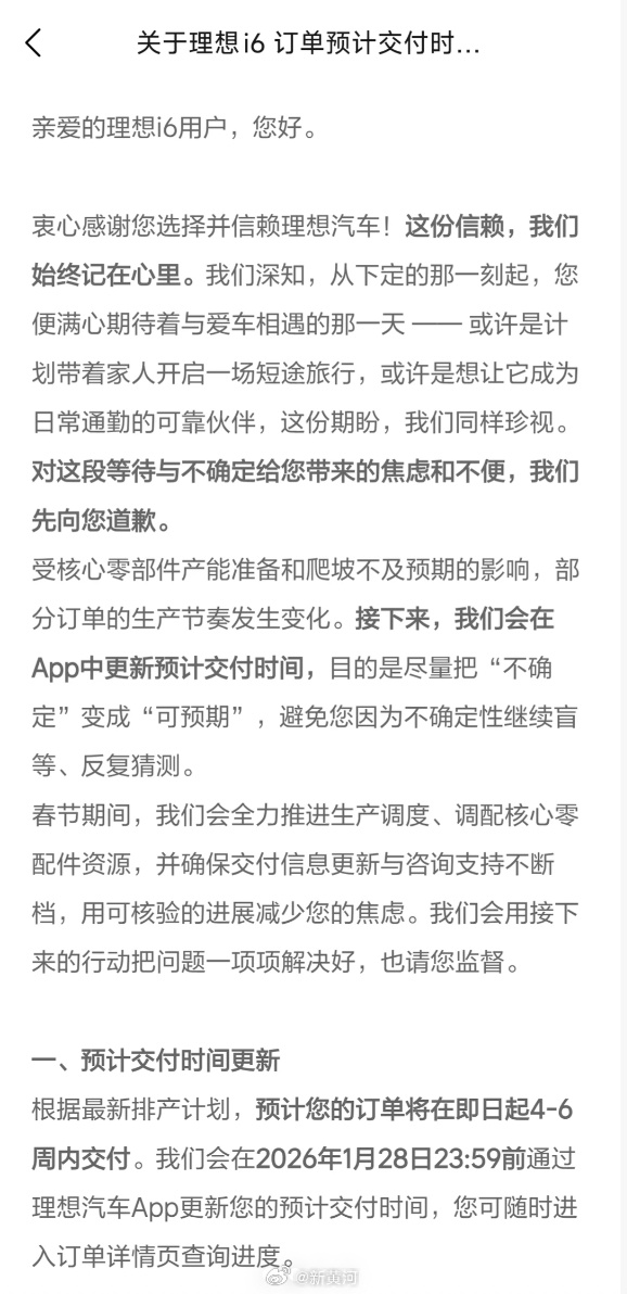 当晚,他像往常一样打开理想汽车App查看进度,弹出了一份《关于理想i6订单预计交付时间更新》的官方公告。公告中,理想汽车承认受“核心零部件产能准备和爬坡不及预期”影响,部分订单生产节奏发生变化。