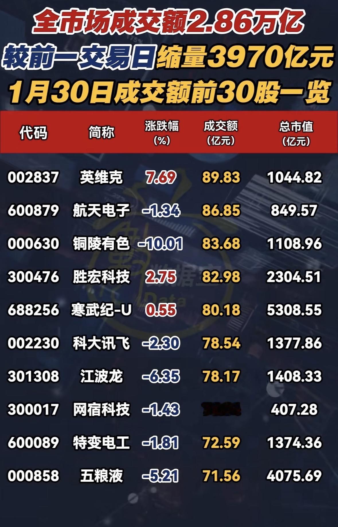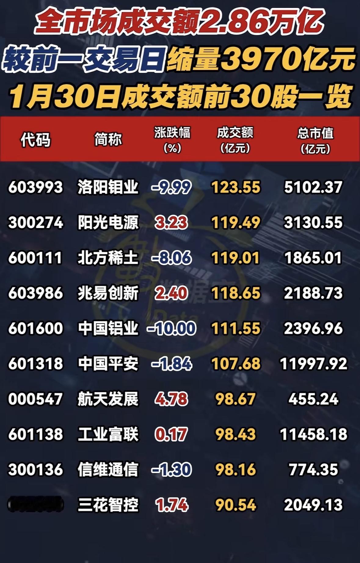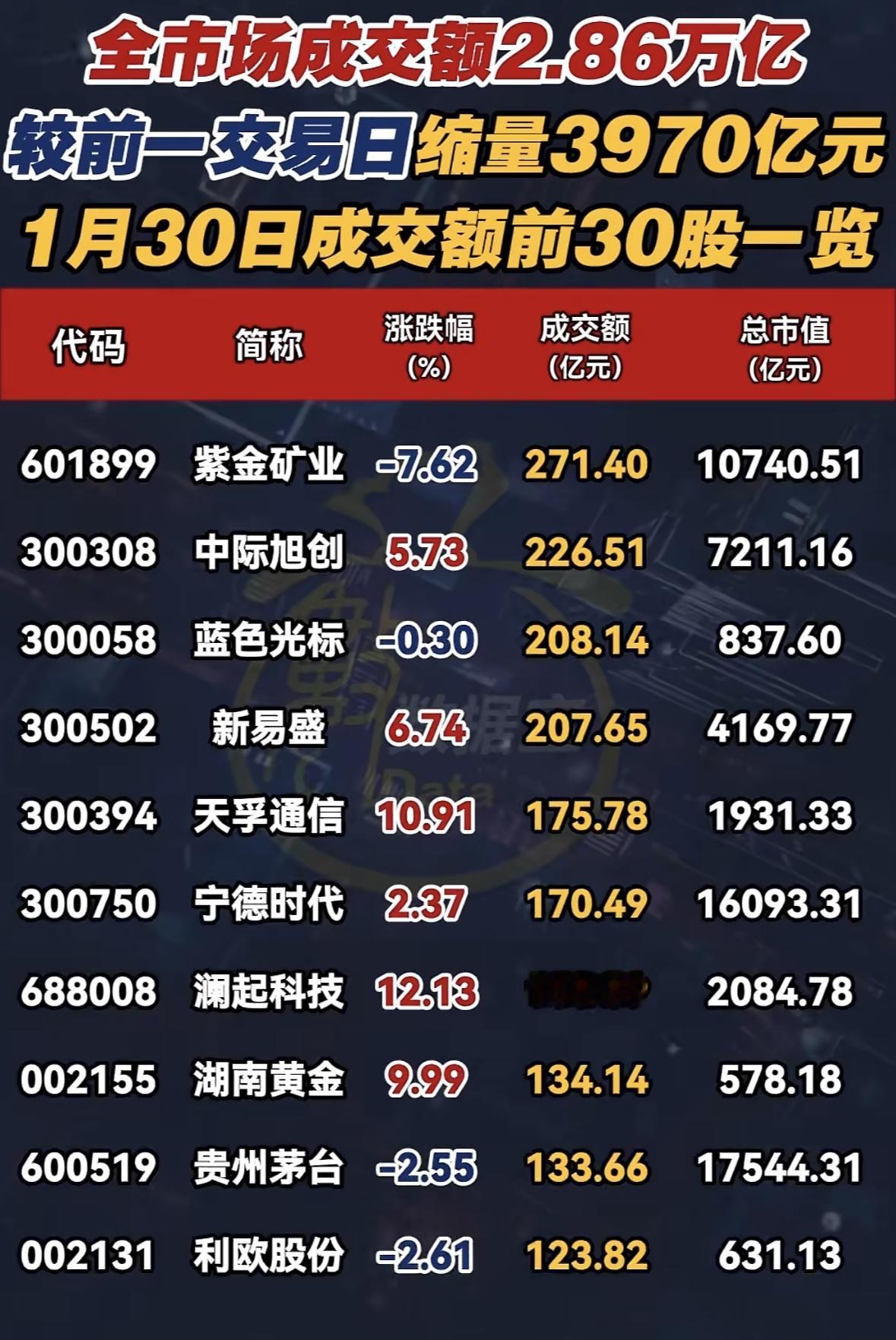 1月30日股市成交前30股一览,涨跌榜实时更新 股市成交缩量,紫金矿业领跌,宁德时代稳居市值榜首,黄金、科技股表现