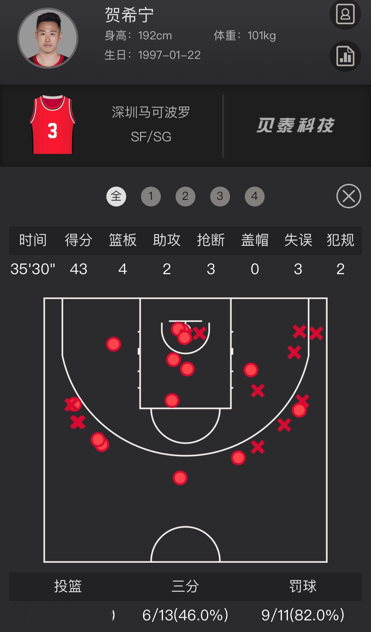 深圳末节最后时刻完成反超后,上海一波10比0带走比赛,贺希宁空砍43分4篮板3抢断,距离自己生涯最高分差1分。上海男篮vs深圳男篮CBA