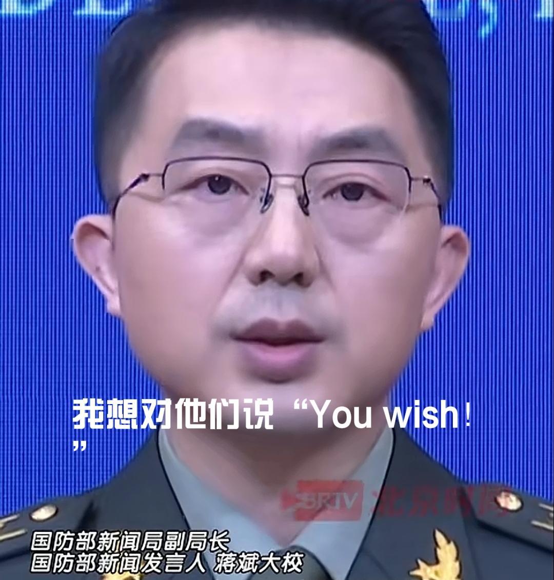 29日,就瑞典、英国、美国、日本等国军工企业及机构发布“击沉”中国海军舰艇的动画视频,蒋斌大校回应称“该行为‘纯属自嗨’,我想对他们说‘You wish(想得美)!’” 在这种语境下是对不自量力和没有礼貌的人对自己的冒犯,用这种稍微粗鲁一点话回击他们非常恰当,总而言之,只要用他们能听得懂的话就对了,省得他们装傻。