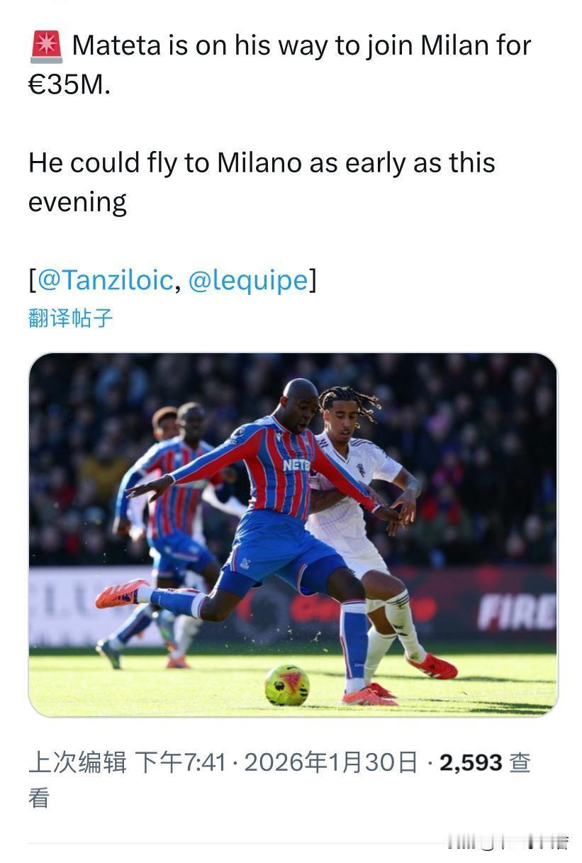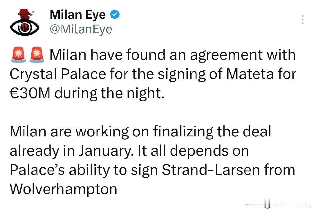 第二签即将到来!依然是一名中锋球员,我们期待已久的中锋马特塔,罗马诺、莫雷托、比安钦均发文证实马特塔很可能转会米兰,最快他今天下午将飞往米兰。 但现在依然要保持乐观,首先水晶宫俱乐部的马特塔替代者依然没有搞定,据说谈判同样十分艰苦,四次米兰这边恩昆库拒绝离开球队,无论是罗马俱乐部还是土耳其费内巴切俱乐部恩昆库均兴趣不足,米兰俱乐部在单线作战情况下是否有必要储存如此多的前锋是一个问题。 隆戈消息说马特塔与米兰达成协议,他将签约4年,年薪350万欧元。实话实说这个价格真的不高,转会也才3000万欧元,不谈能力只说作用,在今天的米兰,阿莱格里的米兰马特塔的作用要大于希门尼斯与恩昆库,如果早点比如夏季窗口我们能搞定马特塔,米兰现在应该是积分榜第一名,但现在也不晚,据说是卡迪纳莱先生希望米兰能取得更优异的成绩,所以冬季窗口米兰才有了动作,但由于时间问题,毕竟卡迪纳莱周一才来的米兰,与阿莱格里和管理层见面,为啥不早点来?他啥时候来其实不重要,重要的是上周才搞定的贷款,现在的米兰卡迪纳莱不受弗拉尼会计限制,他刚刚有了对米兰的绝对话语权。