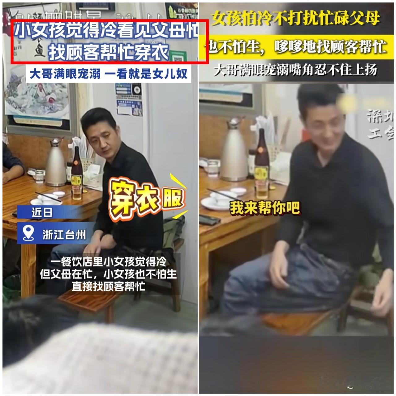 太暖心了! 饭店里小女孩怕打扰忙碌的父母,奶声奶气找陌生叔叔帮忙穿衣服,叔叔二