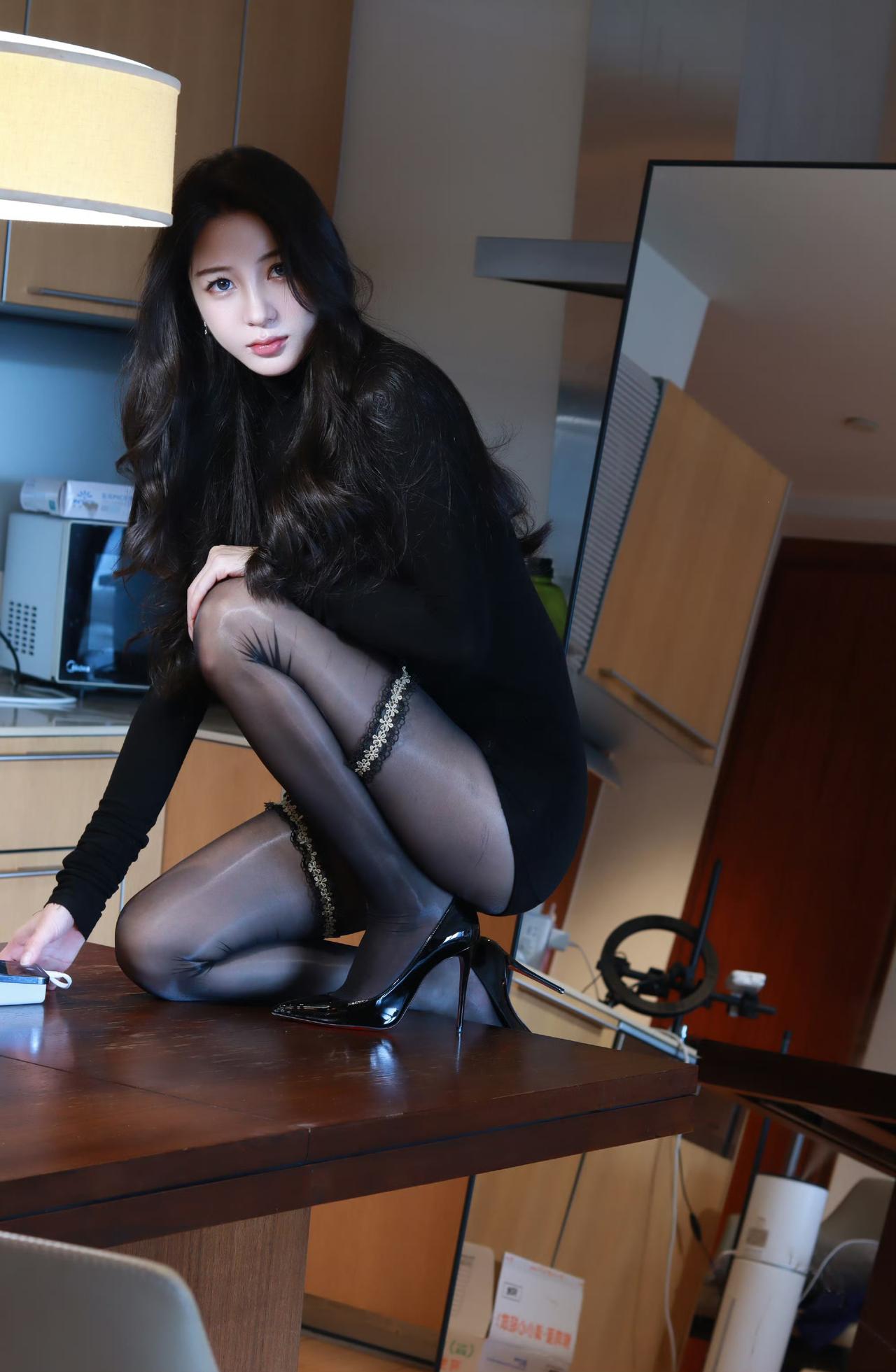 酒红色皮衣搭配红色蕾丝袜|高级感夜拍